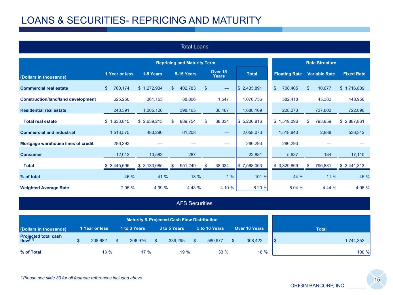ORIGIN BANCORP, INC. _______ Total Loans (Dollars in thousands) Repricing and Maturity Term Rate Structure 1 Year or less 1-5 Years 5-15 Years Over 15 Years Total Floating Rate Variable Rate Fixed Rate Commercial real estate $ 760,174 $ 1,272,934 $ 402,783 $ — $ 2,435,891 $ 708,405 $ 10,677 $ 1,716,809 Construction/land/land development 625,250 361,153 88,806 1,547 1,076,756 582,418 45,382 448,956 Residential real estate 248,391 1,005,126 398,165 36,487 1,688,169 228,273 737,800 722,096 Total real estate $ 1,633,815 $ 2,639,213 $ 889,754 $ 38,034 $ 5,200,816 $ 1,519,096 $ 793,859 $ 2,887,861 Commercial and industrial 1,513,575 483,290 61,208 — 2,058,073 1,518,843 2,888 536,342 Mortgage warehouse lines of credit 286,293 — — — 286,293 286,293 — — Consumer 12,012 10,582 287 — 22,881 5,637 134 17,110 Total $ 3,445,695 $ 3,133,085 $ 951,249 $ 38,034 $ 7,568,063 $ 3,329,869 $ 796,881 $ 3,441,313 % of total 46 % 41 % 13 % 1 % 101 % 44 % 11 % 45 % Weighted Average Rate 7.95 % 4.99 % 4.43 % 4.10 % 6.20 % 8.04 % 4.44 % 4.96 % AFS Securities (Dollars in thousands) Maturity & Projected Cash Flow Distribution Total1 Year or less 1 to 3 Years 3 to 5 Years 5 to 10 Years Over 10 Years Projected total cash flow(16) $ 208,682 $ 306,976 $ 339,295 $ 580,977 $ 308,422 $ 1,744,352 % of Total 13 % 17 % 19 % 33 % 18 % 100 % LOANS & SECURITIES- REPRICING AND MATURITY 15* Please see slide 30 for all footnote references included above.