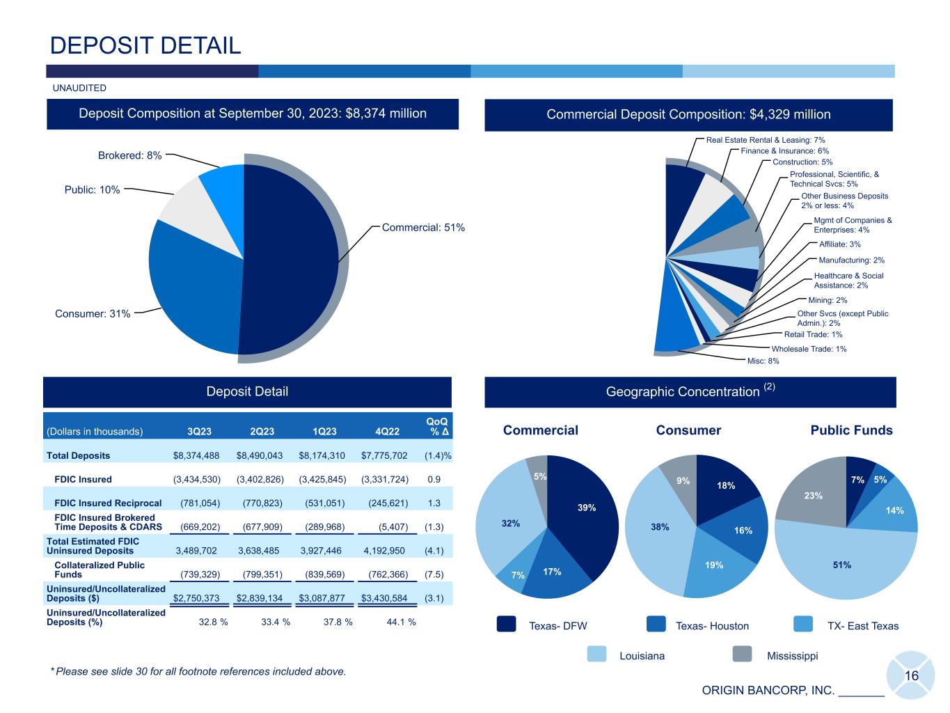 ORIGIN BANCORP, INC. _______ Commercial: 51% Consumer: 31% Public: 10% Brokered: 8% Real Estate Rental & Leasing: 7% Finance & Insurance: 6% Construction: 5% Professional, Scientific, & Technical Svcs: 5% Other Business Deposits 2% or less: 4% Mgmt of Companies & Enterprises: 4% Affiliate: 3% Manufacturing: 2% Healthcare & Social Assistance: 2% Mining: 2% Other Svcs (except Public Admin.): 2% Retail Trade: 1% Wholesale Trade: 1% Misc: 8% 16 DEPOSIT DETAIL (Dollars in thousands) 3Q23 2Q23 1Q23 4Q22 QoQ % Δ Total Deposits $ 8,374,488 $ 8,490,043 $ 8,174,310 $ 7,775,702 (1.4) % FDIC Insured (3,434,530) (3,402,826) (3,425,845) (3,331,724) 0.9 FDIC Insured Reciprocal (781,054) (770,823) (531,051) (245,621) 1.3 FDIC Insured Brokered Time Deposits & CDARS (669,202) (677,909) (289,968) (5,407) (1.3) Total Estimated FDIC Uninsured Deposits 3,489,702 3,638,485 3,927,446 4,192,950 (4.1) Collateralized Public Funds (739,329) (799,351) (839,569) (762,366) (7.5) Uninsured/Uncollateralized Deposits ($) $ 2,750,373 $ 2,839,134 $ 3,087,877 $ 3,430,584 (3.1) Uninsured/Uncollateralized Deposits (%) 32.8 % 33.4 % 37.8 % 44.1 % Deposit Detail Geographic Concentration (2) Commercial Deposit Composition: $4,329 millionDeposit Composition at September 30, 2023: $8,374 million Commercial Public Funds 39% 17%7% 32% 5% Consumer MississippiLouisiana Texas- DFW TX- East TexasTexas- Houston 18% 16% 19% 38% 9% 7% 5% 14% 51% 23% * Please see slide 30 for all footnote references included above. UNAUDITED