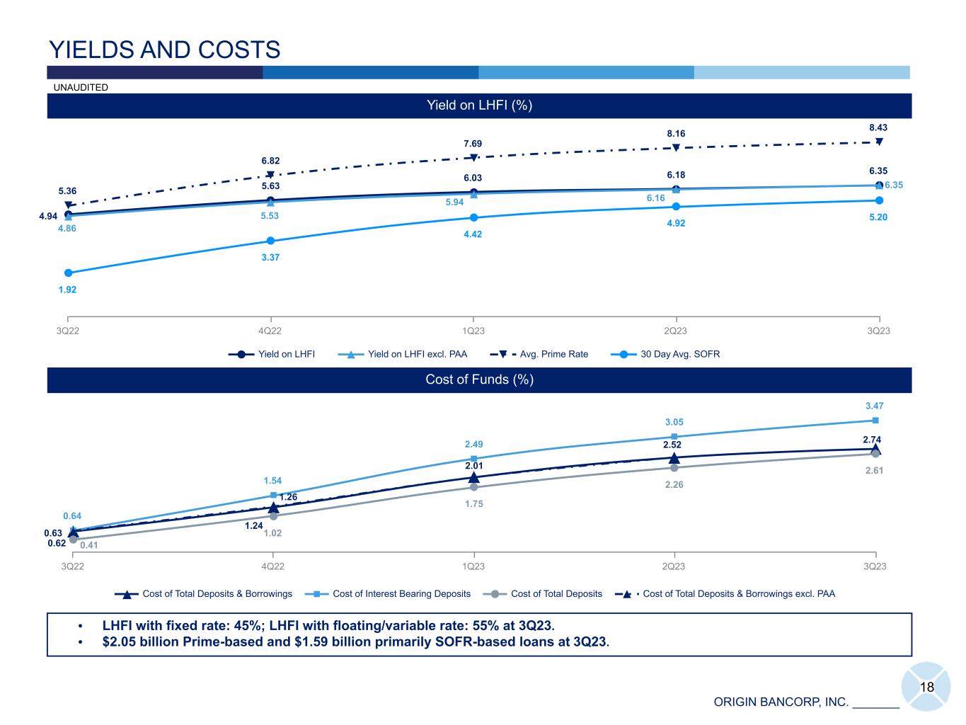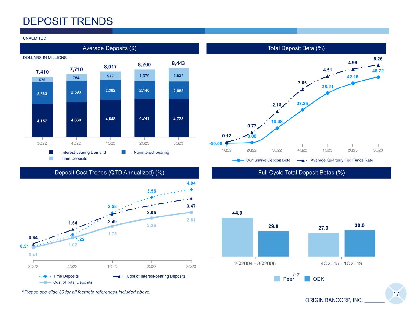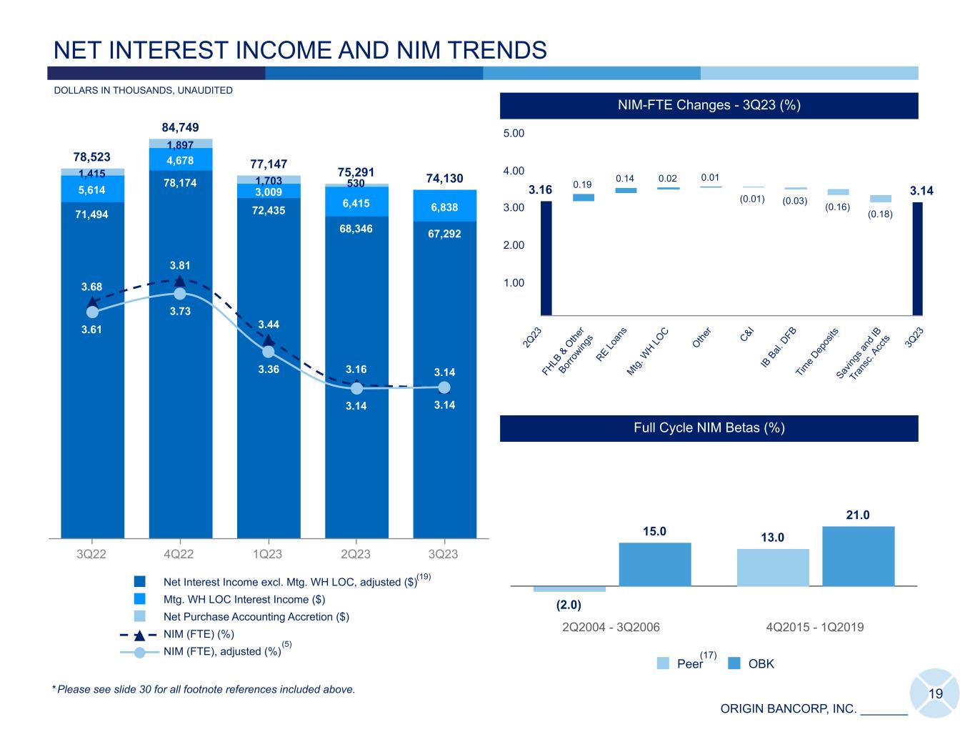 ORIGIN BANCORP, INC. _______ 0.51 2.58 3.56 4.04 0.64 1.54 2.49 3.05 3.47 0.41 1.02 1.75 2.26 2.61 Time Deposits Cost of Interest-bearing Deposits Cost of Total Deposits 3Q22 4Q22 1Q23 2Q23 3Q23 17 7,410 7,710 8,017 8,260 8,443 4,157 4,363 4,648 4,741 4,728 2,583 2,593 2,392 2,140 2,088 670 754 977 1,379 1,627 Interest-bearing Demand Noninterest-bearing Time Deposits 3Q22 4Q22 1Q23 2Q23 3Q23 Average Deposits ($) DEPOSIT TRENDS Deposit Cost Trends (QTD Annualized) (%) IDT Total Deposit Beta (%) Full Cycle Total Deposit Betas (%) 44.0 27.029.0 30.0 Peer OBK 2Q2004 - 3Q2006 4Q2015 - 1Q2019 (17) * Please see slide 30 for all footnote references included above. DOLLARS IN MILLIONS -50.00 0.00 10.48 23.25 35.21 42.16 46.72 0.12 0.77 2.18 3.65 4.51 4.99 5.26 Cumulative Deposit Beta Average Quarterly Fed Funds Rate 1Q22 2Q22 3Q22 4Q22 1Q23 2Q23 3Q23 UNAUDITED 1.22