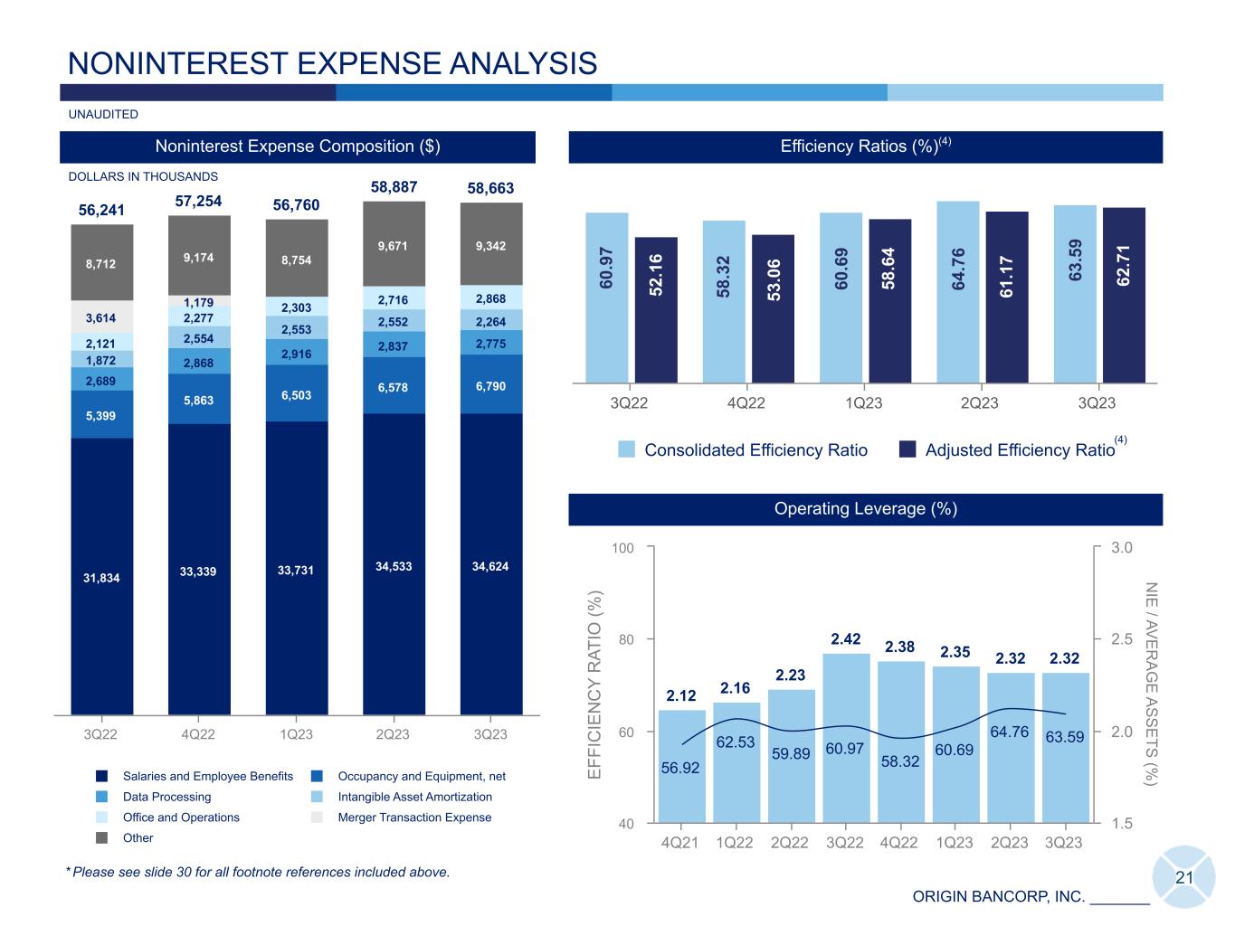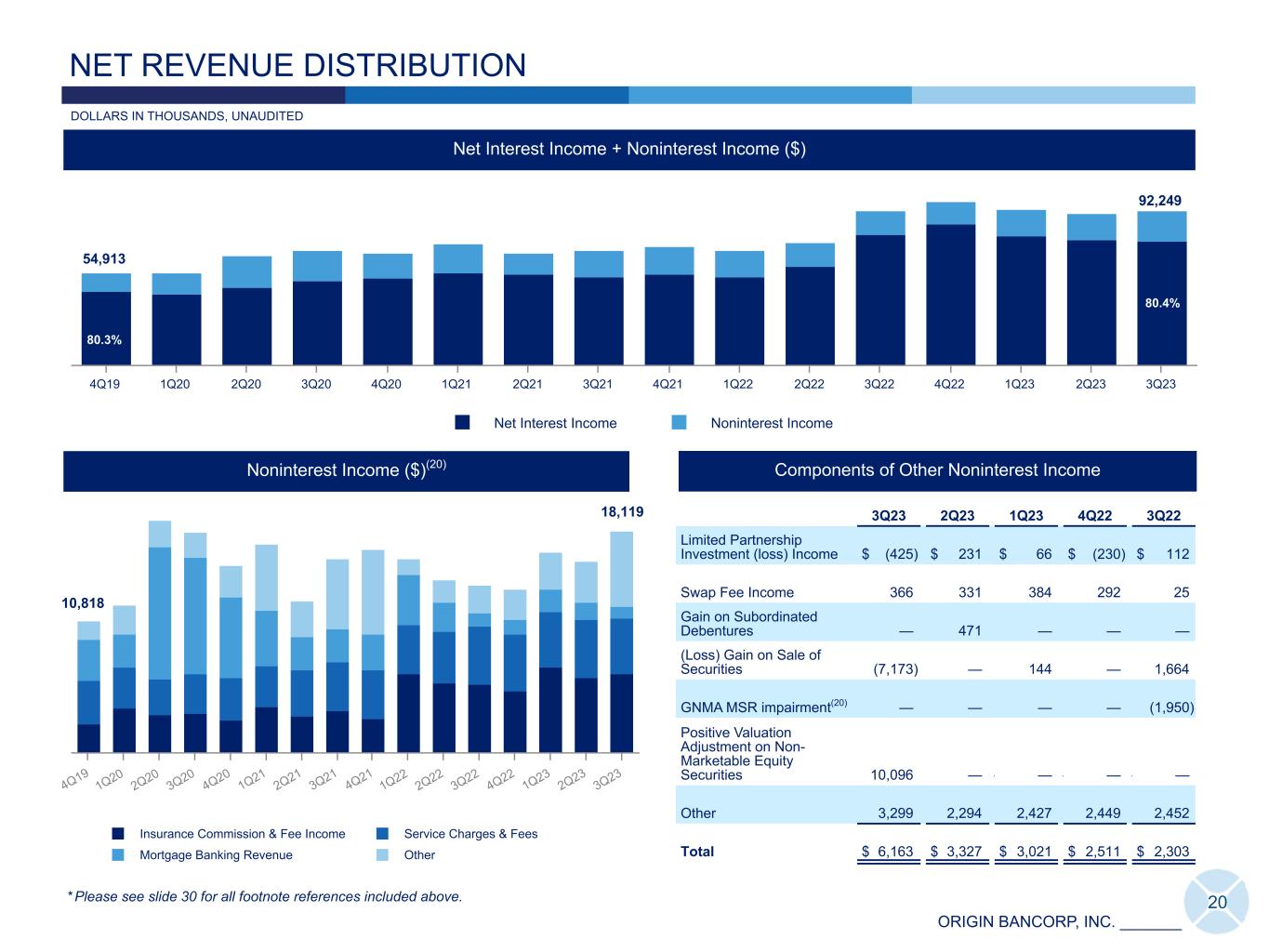 ORIGIN BANCORP, INC. _______ Insurance Commission & Fee Income Service Charges & Fees Mortgage Banking Revenue Other 4Q19 1Q20 2Q20 3Q20 4Q20 1Q21 2Q21 3Q21 4Q21 1Q22 2Q22 3Q22 4Q22 1Q23 2Q23 3Q23 20 Net Interest Income Noninterest Income 4Q19 1Q20 2Q20 3Q20 4Q20 1Q21 2Q21 3Q21 4Q21 1Q22 2Q22 3Q22 4Q22 1Q23 2Q23 3Q23 Noninterest Income ($)(20) Net Interest Income + Noninterest Income ($) NET REVENUE DISTRIBUTION Components of Other Noninterest Income 92,249 3Q23 2Q23 1Q23 4Q22 3Q22 Limited Partnership Investment (loss) Income $ (425) $ 231 $ 66 $ (230) $ 112 Swap Fee Income 366 331 384 292 25 Gain on Subordinated Debentures — 471 — — — (Loss) Gain on Sale of Securities (7,173) — 144 — 1,664 GNMA MSR impairment(20) — — — — (1,950) Positive Valuation Adjustment on Non- Marketable Equity Securities 10,096 — — — — — — — Other 3,299 2,294 2,427 2,449 2,452 Total $ 6,163 $ 3,327 $ 3,021 $ 2,511 $ 2,303 54,913 18,119 80.3% 80.4% * Please see slide 30 for all footnote references included above. DOLLARS IN THOUSANDS, UNAUDITED 10,818