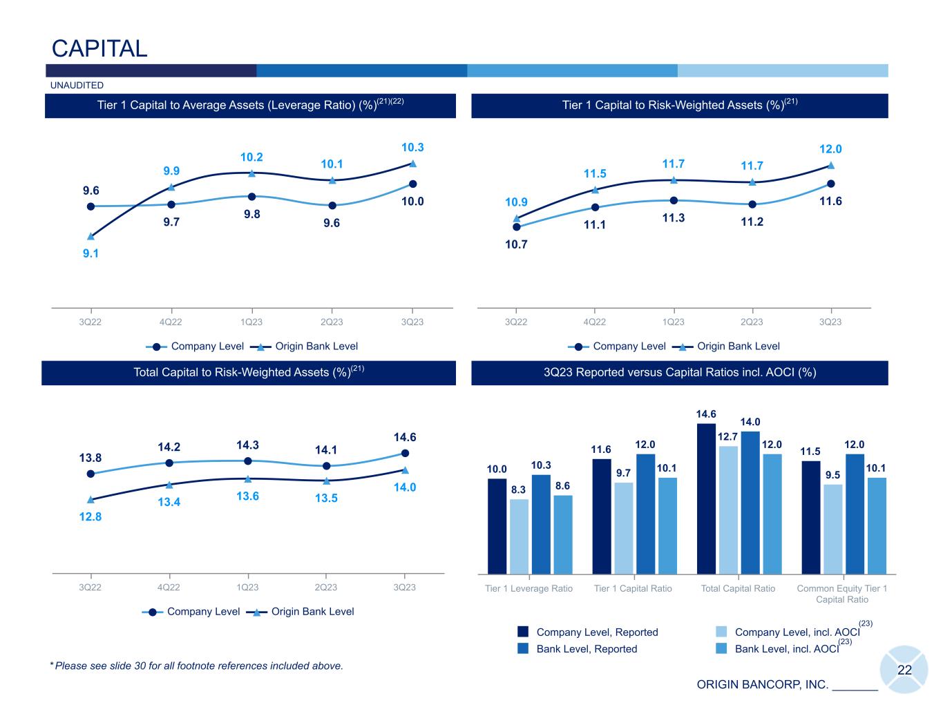 ORIGIN BANCORP, INC. _______ 9.6 9.7 9.8 9.6 10.0 9.1 9.9 10.2 10.1 10.3 Company Level Origin Bank Level 3Q22 4Q22 1Q23 2Q23 3Q23 10.7 11.1 11.3 11.2 11.610.9 11.5 11.7 11.7 12.0 Company Level Origin Bank Level 3Q22 4Q22 1Q23 2Q23 3Q23 22 CAPITAL 13.8 14.2 14.3 14.1 14.6 12.8 13.4 13.6 13.5 14.0 Company Level Origin Bank Level 3Q22 4Q22 1Q23 2Q23 3Q23 3Q23 Reported versus Capital Ratios incl. AOCI (%) ICap ICap Total Capital to Risk-Weighted Assets (%)(21) Tier 1 Capital to Risk-Weighted Assets (%)(21)Tier 1 Capital to Average Assets (Leverage Ratio) (%)(21)(22) * Please see slide 30 for all footnote references included above. 10.0 11.6 14.6 11.5 8.3 9.7 12.7 9.5 10.3 12.0 14.0 12.0 8.6 10.1 12.0 10.1 Company Level, Reported Company Level, incl. AOCI Bank Level, Reported Bank Level, incl. AOCI Tier 1 Leverage Ratio Tier 1 Capital Ratio Total Capital Ratio Common Equity Tier 1 Capital Ratio (23) (23) UNAUDITED