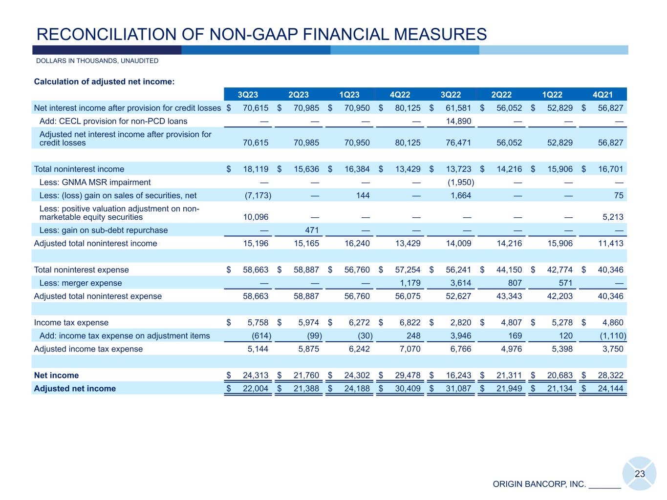 ORIGIN BANCORP, INC. _______ Calculation of adjusted net income: 3Q23 2Q23 1Q23 4Q22 3Q22 2Q22 1Q22 4Q21 Net interest income after provision for credit losses $ 70,615 $ 70,985 $ 70,950 $ 80,125 $ 61,581 $ 56,052 $ 52,829 $ 56,827 Add: CECL provision for non-PCD loans — — — — 14,890 — — — Adjusted net interest income after provision for credit losses 70,615 70,985 70,950 80,125 76,471 56,052 52,829 56,827 Total noninterest income $ 18,119 $ 15,636 $ 16,384 $ 13,429 $ 13,723 $ 14,216 $ 15,906 $ 16,701 Less: GNMA MSR impairment — — — — (1,950) — — — Less: (loss) gain on sales of securities, net (7,173) — 144 — 1,664 — — 75 Less: positive valuation adjustment on non- marketable equity securities 10,096 — — — — — — 5,213 Less: gain on sub-debt repurchase — 471 — — — — — — Adjusted total noninterest income 15,196 15,165 16,240 13,429 14,009 14,216 15,906 11,413 Total noninterest expense $ 58,663 $ 58,887 $ 56,760 $ 57,254 $ 56,241 $ 44,150 $ 42,774 $ 40,346 Less: merger expense — — — 1,179 3,614 807 571 — Adjusted total noninterest expense 58,663 58,887 56,760 56,075 52,627 43,343 42,203 40,346 Income tax expense $ 5,758 $ 5,974 $ 6,272 $ 6,822 $ 2,820 $ 4,807 $ 5,278 $ 4,860 Add: income tax expense on adjustment items (614) (99) (30) 248 3,946 169 120 (1,110) Adjusted income tax expense 5,144 5,875 6,242 7,070 6,766 4,976 5,398 3,750 Net income $ 24,313 $ 21,760 $ 24,302 $ 29,478 $ 16,243 $ 21,311 $ 20,683 $ 28,322 Adjusted net income $ 22,004 $ 21,388 $ 24,188 $ 30,409 $ 31,087 $ 21,949 $ 21,134 $ 24,144 23 DOLLARS IN THOUSANDS, UNAUDITED RECONCILIATION OF NON-GAAP FINANCIAL MEASURES