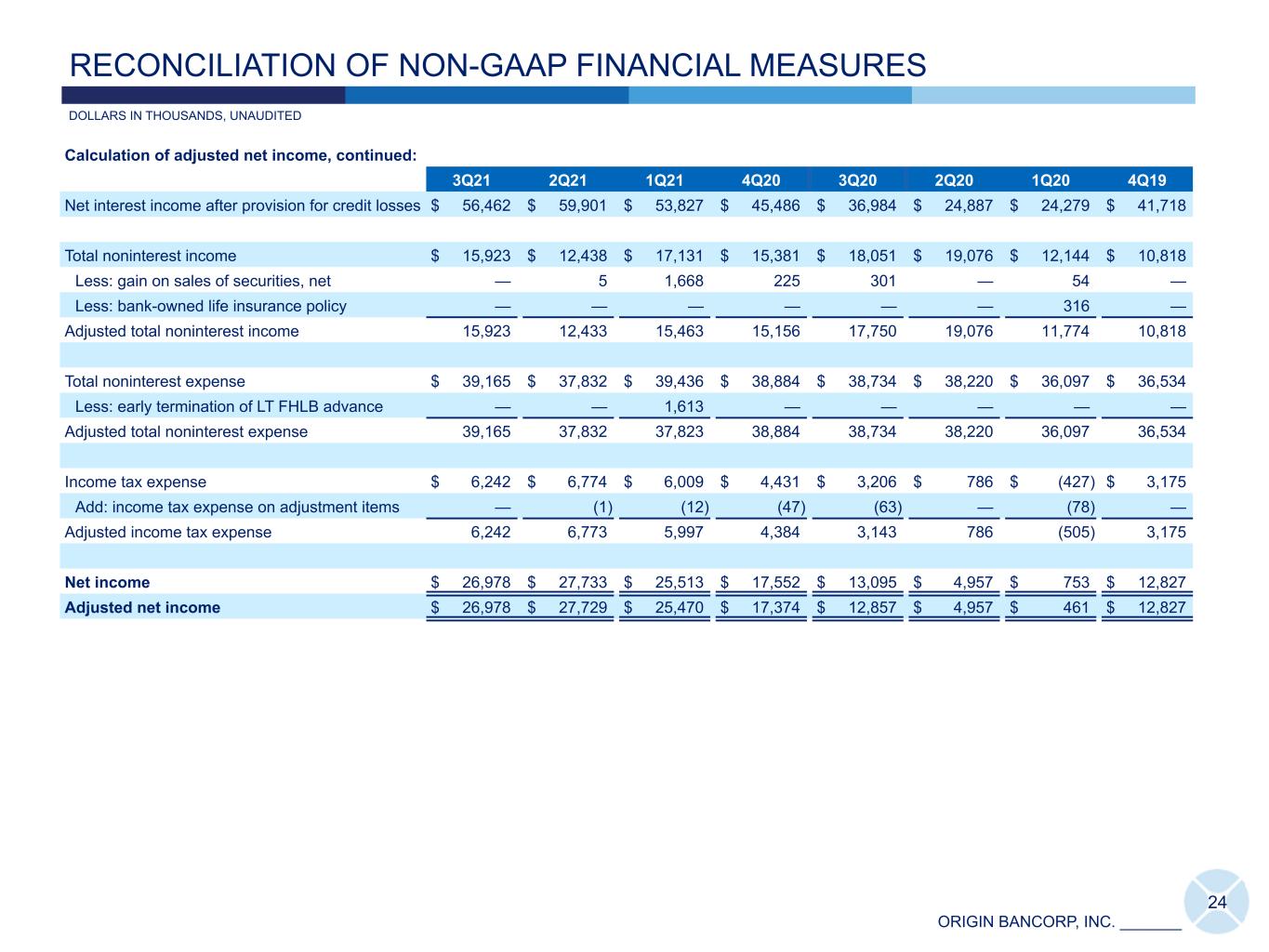 ORIGIN BANCORP, INC. _______ Calculation of adjusted net income, continued: 3Q21 2Q21 1Q21 4Q20 3Q20 2Q20 1Q20 4Q19 Net interest income after provision for credit losses $ 56,462 $ 59,901 $ 53,827 $ 45,486 $ 36,984 $ 24,887 $ 24,279 $ 41,718 Total noninterest income $ 15,923 $ 12,438 $ 17,131 $ 15,381 $ 18,051 $ 19,076 $ 12,144 $ 10,818 Less: gain on sales of securities, net — 5 1,668 225 301 — 54 — Less: bank-owned life insurance policy — — — — — — 316 — Adjusted total noninterest income 15,923 12,433 15,463 15,156 17,750 19,076 11,774 10,818 Total noninterest expense $ 39,165 $ 37,832 $ 39,436 $ 38,884 $ 38,734 $ 38,220 $ 36,097 $ 36,534 Less: early termination of LT FHLB advance — — 1,613 — — — — — Adjusted total noninterest expense 39,165 37,832 37,823 38,884 38,734 38,220 36,097 36,534 Income tax expense $ 6,242 $ 6,774 $ 6,009 $ 4,431 $ 3,206 $ 786 $ (427) $ 3,175 Add: income tax expense on adjustment items — (1) (12) (47) (63) — (78) — Adjusted income tax expense 6,242 6,773 5,997 4,384 3,143 786 (505) 3,175 Net income $ 26,978 $ 27,733 $ 25,513 $ 17,552 $ 13,095 $ 4,957 $ 753 $ 12,827 Adjusted net income $ 26,978 $ 27,729 $ 25,470 $ 17,374 $ 12,857 $ 4,957 $ 461 $ 12,827 24 DOLLARS IN THOUSANDS, UNAUDITED RECONCILIATION OF NON-GAAP FINANCIAL MEASURES