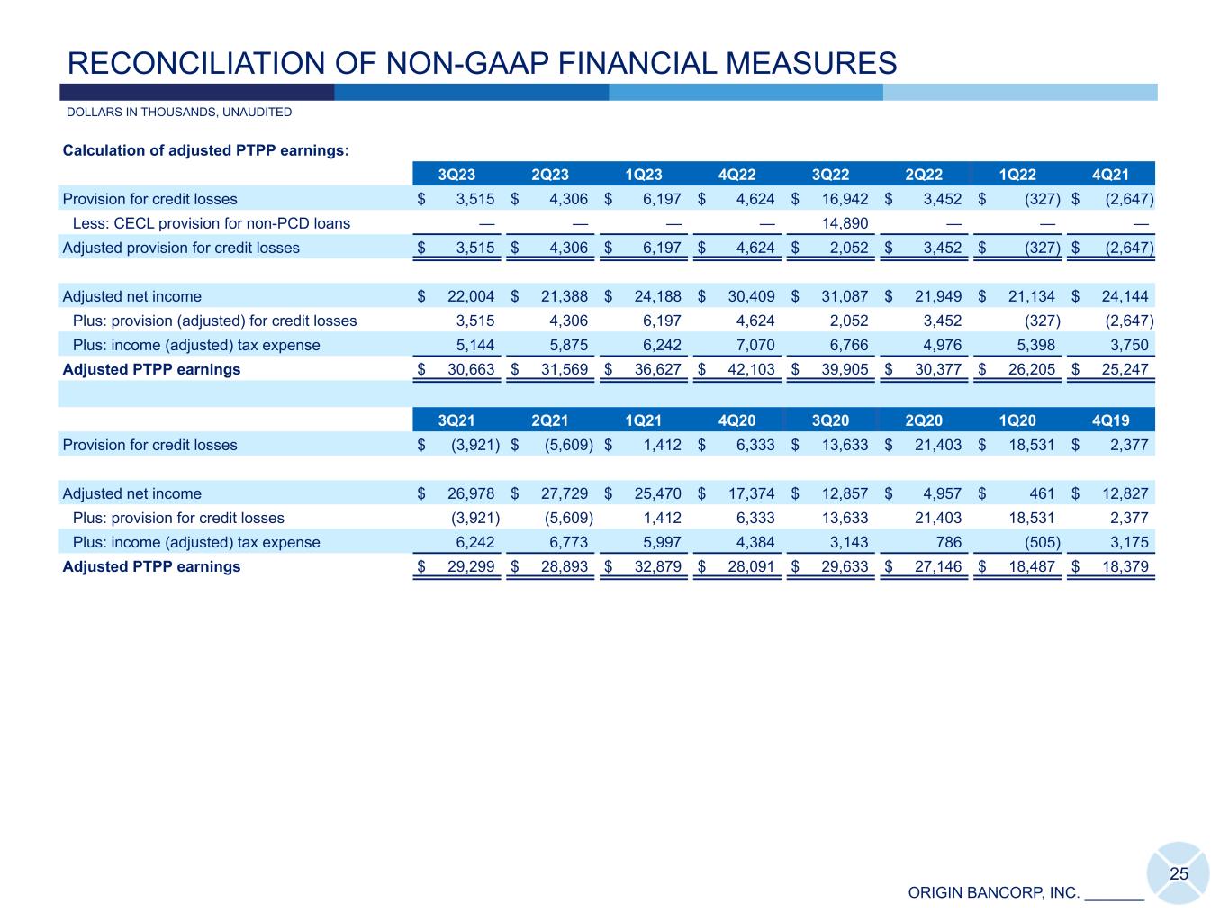 ORIGIN BANCORP, INC. _______ Calculation of adjusted PTPP earnings: 3Q23 2Q23 1Q23 4Q22 3Q22 2Q22 1Q22 4Q21 Provision for credit losses $ 3,515 $ 4,306 $ 6,197 $ 4,624 $ 16,942 $ 3,452 $ (327) $ (2,647) Less: CECL provision for non-PCD loans — — — — 14,890 — — — Adjusted provision for credit losses $ 3,515 $ 4,306 $ 6,197 $ 4,624 $ 2,052 $ 3,452 $ (327) $ (2,647) Adjusted net income $ 22,004 $ 21,388 $ 24,188 $ 30,409 $ 31,087 $ 21,949 $ 21,134 $ 24,144 Plus: provision (adjusted) for credit losses 3,515 4,306 6,197 4,624 2,052 3,452 (327) (2,647) Plus: income (adjusted) tax expense 5,144 5,875 6,242 7,070 6,766 4,976 5,398 3,750 Adjusted PTPP earnings $ 30,663 $ 31,569 $ 36,627 $ 42,103 $ 39,905 $ 30,377 $ 26,205 $ 25,247 3Q21 2Q21 1Q21 4Q20 3Q20 2Q20 1Q20 4Q19 Provision for credit losses $ (3,921) $ (5,609) $ 1,412 $ 6,333 $ 13,633 $ 21,403 $ 18,531 $ 2,377 Adjusted net income $ 26,978 $ 27,729 $ 25,470 $ 17,374 $ 12,857 $ 4,957 $ 461 $ 12,827 Plus: provision for credit losses (3,921) (5,609) 1,412 6,333 13,633 21,403 18,531 2,377 Plus: income (adjusted) tax expense 6,242 6,773 5,997 4,384 3,143 786 (505) 3,175 Adjusted PTPP earnings $ 29,299 $ 28,893 $ 32,879 $ 28,091 $ 29,633 $ 27,146 $ 18,487 $ 18,379 25 DOLLARS IN THOUSANDS, UNAUDITED RECONCILIATION OF NON-GAAP FINANCIAL MEASURES
