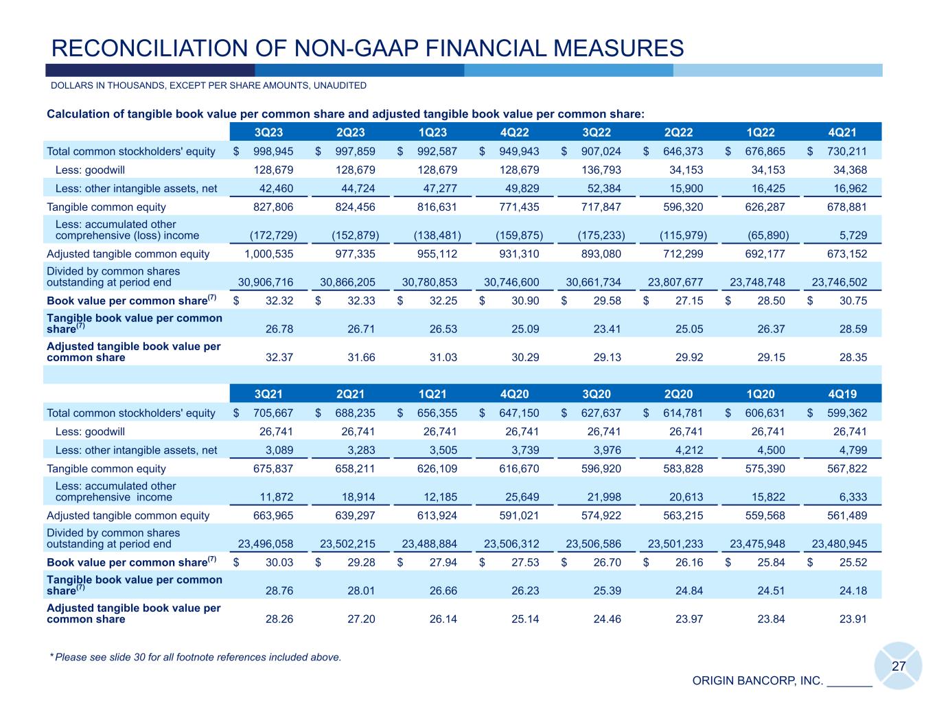 ORIGIN BANCORP, INC. _______ Calculation of tangible book value per common share and adjusted tangible book value per common share: 3Q23 2Q23 1Q23 4Q22 3Q22 2Q22 1Q22 4Q21 Total common stockholders' equity $ 998,945 $ 997,859 $ 992,587 $ 949,943 $ 907,024 $ 646,373 $ 676,865 $ 730,211 Less: goodwill 128,679 128,679 128,679 128,679 136,793 34,153 34,153 34,368 Less: other intangible assets, net 42,460 44,724 47,277 49,829 52,384 15,900 16,425 16,962 Tangible common equity 827,806 824,456 816,631 771,435 717,847 596,320 626,287 678,881 Less: accumulated other comprehensive (loss) income (172,729) (152,879) (138,481) (159,875) (175,233) (115,979) (65,890) 5,729 Adjusted tangible common equity 1,000,535 977,335 955,112 931,310 893,080 712,299 692,177 673,152 Divided by common shares outstanding at period end 30,906,716 30,866,205 30,780,853 30,746,600 30,661,734 23,807,677 23,748,748 23,746,502 Book value per common share(7) $ 32.32 $ 32.33 $ 32.25 $ 30.90 $ 29.58 $ 27.15 $ 28.50 $ 30.75 Tangible book value per common share(7) 26.78 26.71 26.53 25.09 23.41 25.05 26.37 28.59 Adjusted tangible book value per common share 32.37 31.66 31.03 30.29 29.13 29.92 29.15 28.35 3Q21 2Q21 1Q21 4Q20 3Q20 2Q20 1Q20 4Q19 Total common stockholders' equity $ 705,667 $ 688,235 $ 656,355 $ 647,150 $ 627,637 $ 614,781 $ 606,631 $ 599,362 Less: goodwill 26,741 26,741 26,741 26,741 26,741 26,741 26,741 26,741 Less: other intangible assets, net 3,089 3,283 3,505 3,739 3,976 4,212 4,500 4,799 Tangible common equity 675,837 658,211 626,109 616,670 596,920 583,828 575,390 567,822 Less: accumulated other comprehensive income 11,872 18,914 12,185 25,649 21,998 20,613 15,822 6,333 Adjusted tangible common equity 663,965 639,297 613,924 591,021 574,922 563,215 559,568 561,489 Divided by common shares outstanding at period end 23,496,058 23,502,215 23,488,884 23,506,312 23,506,586 23,501,233 23,475,948 23,480,945 Book value per common share(7) $ 30.03 $ 29.28 $ 27.94 $ 27.53 $ 26.70 $ 26.16 $ 25.84 $ 25.52 Tangible book value per common share(7) 28.76 28.01 26.66 26.23 25.39 24.84 24.51 24.18 Adjusted tangible book value per common share 28.26 27.20 26.14 25.14 24.46 23.97 23.84 23.91 27 RECONCILIATION OF NON-GAAP FINANCIAL MEASURES * Please see slide 30 for all footnote references included above. DOLLARS IN THOUSANDS, EXCEPT PER SHARE AMOUNTS, UNAUDITED
