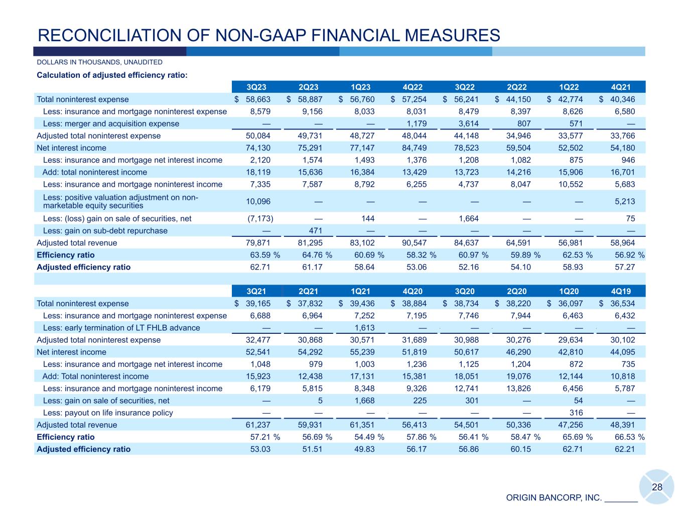 ORIGIN BANCORP, INC. _______ RECONCILIATION OF NON-GAAP FINANCIAL MEASURES DOLLARS IN THOUSANDS, UNAUDITED Calculation of adjusted efficiency ratio: 3Q23 2Q23 1Q23 4Q22 3Q22 2Q22 1Q22 4Q21 Total noninterest expense $ 58,663 $ 58,887 $ 56,760 $ 57,254 $ 56,241 $ 44,150 $ 42,774 $ 40,346 Less: insurance and mortgage noninterest expense 8,579 9,156 8,033 8,031 8,479 8,397 8,626 6,580 Less: merger and acquisition expense — — — 1,179 3,614 807 571 — Adjusted total noninterest expense 50,084 49,731 48,727 48,044 44,148 34,946 33,577 33,766 Net interest income 74,130 75,291 77,147 84,749 78,523 59,504 52,502 54,180 Less: insurance and mortgage net interest income 2,120 1,574 1,493 1,376 1,208 1,082 875 946 Add: total noninterest income 18,119 15,636 16,384 13,429 13,723 14,216 15,906 16,701 Less: insurance and mortgage noninterest income 7,335 7,587 8,792 6,255 4,737 8,047 10,552 5,683 Less: positive valuation adjustment on non- marketable equity securities 10,096 — — — — — — 5,213 Less: (loss) gain on sale of securities, net (7,173) — 144 — 1,664 — — 75 Less: gain on sub-debt repurchase — 471 — — — — — — Adjusted total revenue 79,871 81,295 83,102 90,547 84,637 64,591 56,981 58,964 Efficiency ratio 63.59 % 64.76 % 60.69 % 58.32 % 60.97 % 59.89 % 62.53 % 56.92 % Adjusted efficiency ratio 62.71 61.17 58.64 53.06 52.16 54.10 58.93 57.27 3Q21 2Q21 1Q21 4Q20 3Q20 2Q20 1Q20 4Q19 Total noninterest expense $ 39,165 $ 37,832 $ 39,436 $ 38,884 $ 38,734 $ 38,220 $ 36,097 $ 36,534 Less: insurance and mortgage noninterest expense 6,688 6,964 7,252 7,195 7,746 7,944 6,463 6,432 Less: early termination of LT FHLB advance — — 1,613 — — — — — — — — Adjusted total noninterest expense 32,477 30,868 30,571 31,689 30,988 30,276 29,634 30,102 Net interest income 52,541 54,292 55,239 51,819 50,617 46,290 42,810 44,095 Less: insurance and mortgage net interest income 1,048 979 1,003 1,236 1,125 1,204 872 735 Add: Total noninterest income 15,923 12,438 17,131 15,381 18,051 19,076 12,144 10,818 Less: insurance and mortgage noninterest income 6,179 5,815 8,348 9,326 12,741 13,826 6,456 5,787 Less: gain on sale of securities, net — 5 1,668 225 301 — 54 — Less: payout on life insurance policy — — — — — — — 316 — Adjusted total revenue 61,237 59,931 61,351 56,413 54,501 50,336 47,256 48,391 Efficiency ratio 57.21 % 56.69 % 54.49 % 57.86 % 56.41 % 58.47 % 65.69 % 66.53 % Adjusted efficiency ratio 53.03 51.51 49.83 56.17 56.86 60.15 62.71 62.21 28