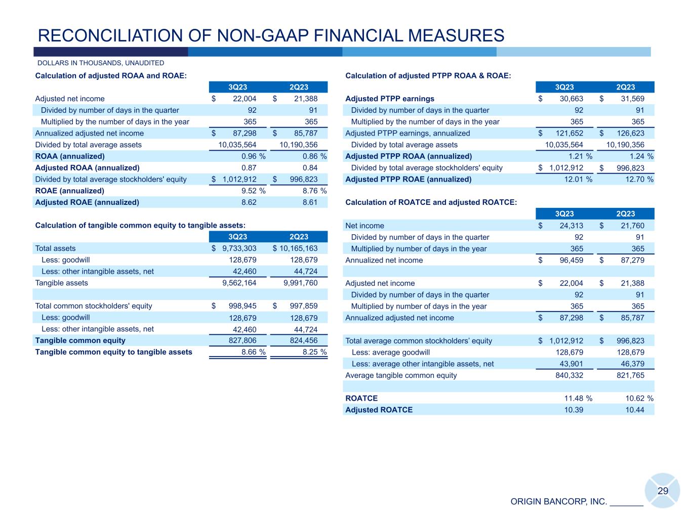 ORIGIN BANCORP, INC. _______ Calculation of adjusted ROAA and ROAE: Calculation of adjusted PTPP ROAA & ROAE: 3Q23 2Q23 3Q23 2Q23 Adjusted net income $ 22,004 $ 21,388 Adjusted PTPP earnings $ 30,663 $ 31,569 Divided by number of days in the quarter 92 91 Divided by number of days in the quarter 92 91 Multiplied by the number of days in the year 365 365 Multiplied by the number of days in the year 365 365 Annualized adjusted net income $ 87,298 $ 85,787 Adjusted PTPP earnings, annualized $ 121,652 $ 126,623 Divided by total average assets 10,035,564 10,190,356 Divided by total average assets 10,035,564 10,190,356 ROAA (annualized) 0.96 % 0.86 % Adjusted PTPP ROAA (annualized) 1.21 % 1.24 % Adjusted ROAA (annualized) 0.87 0.84 Divided by total average stockholders' equity $ 1,012,912 $ 996,823 Divided by total average stockholders' equity $ 1,012,912 $ 996,823 Adjusted PTPP ROAE (annualized) 12.01 % 12.70 % ROAE (annualized) 9.52 % 8.76 % Adjusted ROAE (annualized) 8.62 8.61 Calculation of ROATCE and adjusted ROATCE: 3Q23 2Q23 Calculation of tangible common equity to tangible assets: Net income $ 24,313 $ 21,760 3Q23 2Q23 Divided by number of days in the quarter 92 91 Total assets $ 9,733,303 $ 10,165,163 Multiplied by number of days in the year 365 365 Less: goodwill 128,679 128,679 Annualized net income $ 96,459 $ 87,279 Less: other intangible assets, net 42,460 44,724 Tangible assets 9,562,164 9,991,760 Adjusted net income $ 22,004 $ 21,388 Divided by number of days in the quarter 92 91 Total common stockholders' equity $ 998,945 $ 997,859 Multiplied by number of days in the year 365 365 Less: goodwill 128,679 128,679 Annualized adjusted net income $ 87,298 $ 85,787 Less: other intangible assets, net 42,460 44,724 Tangible common equity 827,806 824,456 Total average common stockholders’ equity $ 1,012,912 $ 996,823 Tangible common equity to tangible assets 8.66 % 8.25 % Less: average goodwill 128,679 128,679 Less: average other intangible assets, net 43,901 46,379 Average tangible common equity 840,332 821,765 ROATCE 11.48 % 10.62 % Adjusted ROATCE 10.39 10.44 29 DOLLARS IN THOUSANDS, UNAUDITED RECONCILIATION OF NON-GAAP FINANCIAL MEASURES
