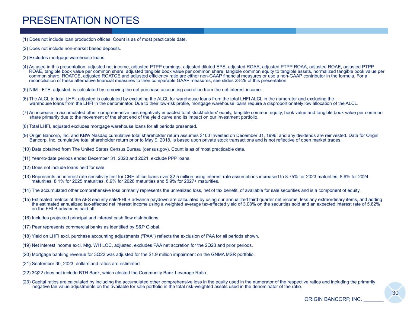 ORIGIN BANCORP, INC. _______ 30 PRESENTATION NOTES (1) Does not include loan production offices. Count is as of most practicable date. (2) Does not include non-market based deposits. (3) Excludes mortgage warehouse loans. (4) As used in this presentation, adjusted net income, adjusted PTPP earnings, adjusted diluted EPS, adjusted ROAA, adjusted PTPP ROAA, adjusted ROAE, adjusted PTPP ROAE, tangible book value per common share, adjusted tangible book value per common share, tangible common equity to tangible assets, normalized tangible book value per common share, ROATCE, adjusted ROATCE and adjusted efficiency ratio are either non-GAAP financial measures or use a non-GAAP contributor in the formula. For a reconciliation of these alternative financial measures to their comparable GAAP measures, see slides 23-29 of this presentation. (5) NIM - FTE, adjusted, is calculated by removing the net purchase accounting accretion from the net interest income. (6) The ALCL to total LHFI, adjusted is calculated by excluding the ALCL for warehouse loans from the total LHFI ALCL in the numerator and excluding the warehouse loans from the LHFI in the denominator. Due to their low-risk profile, mortgage warehouse loans require a disproportionately low allocation of the ALCL. (7) An increase in accumulated other comprehensive loss negatively impacted total stockholders' equity, tangible common equity, book value and tangible book value per common share primarily due to the movement of the short end of the yield curve and its impact on our investment portfolio. (8) Total LHFI, adjusted excludes mortgage warehouse loans for all periods presented. (9) Origin Bancorp, Inc. and KBW Nasdaq cumulative total shareholder return assumes $100 Invested on December 31, 1996, and any dividends are reinvested. Data for Origin Bancorp, Inc. cumulative total shareholder return prior to May 9, 2018, is based upon private stock transactions and is not reflective of open market trades. (10) Data obtained from The United States Census Bureau (census.gov). Count is as of most practicable date. (11) Year-to-date periods ended December 31, 2020 and 2021, exclude PPP loans. (12) Does not include loans held for sale. (13) Represents an interest rate sensitivity test for CRE office loans over $2.5 million using interest rate assumptions increased to 8.75% for 2023 maturities, 8.6% for 2024 maturities, 8.1% for 2025 maturities, 6.9% for 2026 maturities and 5.9% for 2027+ maturities. (14) The accumulated other comprehensive loss primarily represents the unrealized loss, net of tax benefit, of available for sale securities and is a component of equity. (15) Estimated metrics of the AFS security sale/FHLB advance paydown are calculated by using our annualized third quarter net income, less any extraordinary items, and adding the estimated annualized tax-effected net interest income using a weighted average tax-effected yield of 3.08% on the securities sold and an expected interest rate of 5.62% on the FHLB advances paid off. (16) Includes projected principal and interest cash flow distributions. (17) Peer represents commercial banks as identified by S&P Global. (18) Yield on LHFI excl. purchase accounting adjustments ("PAA") reflects the exclusion of PAA for all periods shown. (19) Net interest income excl. Mtg. WH LOC, adjusted, excludes PAA net accretion for the 2Q23 and prior periods. (20) Mortgage banking revenue for 3Q22 was adjusted for the $1.9 million impairment on the GNMA MSR portfolio. (21) September 30, 2023, dollars and ratios are estimated. (22) 3Q22 does not include BTH Bank, which elected the Community Bank Leverage Ratio. (23) Capital ratios are calculated by including the accumulated other comprehensive loss in the equity used in the numerator of the respective ratios and including the primarily negative fair value adjustments on the available for sale portfolio in the total risk-weighted assets used in the denominator of the ratio.