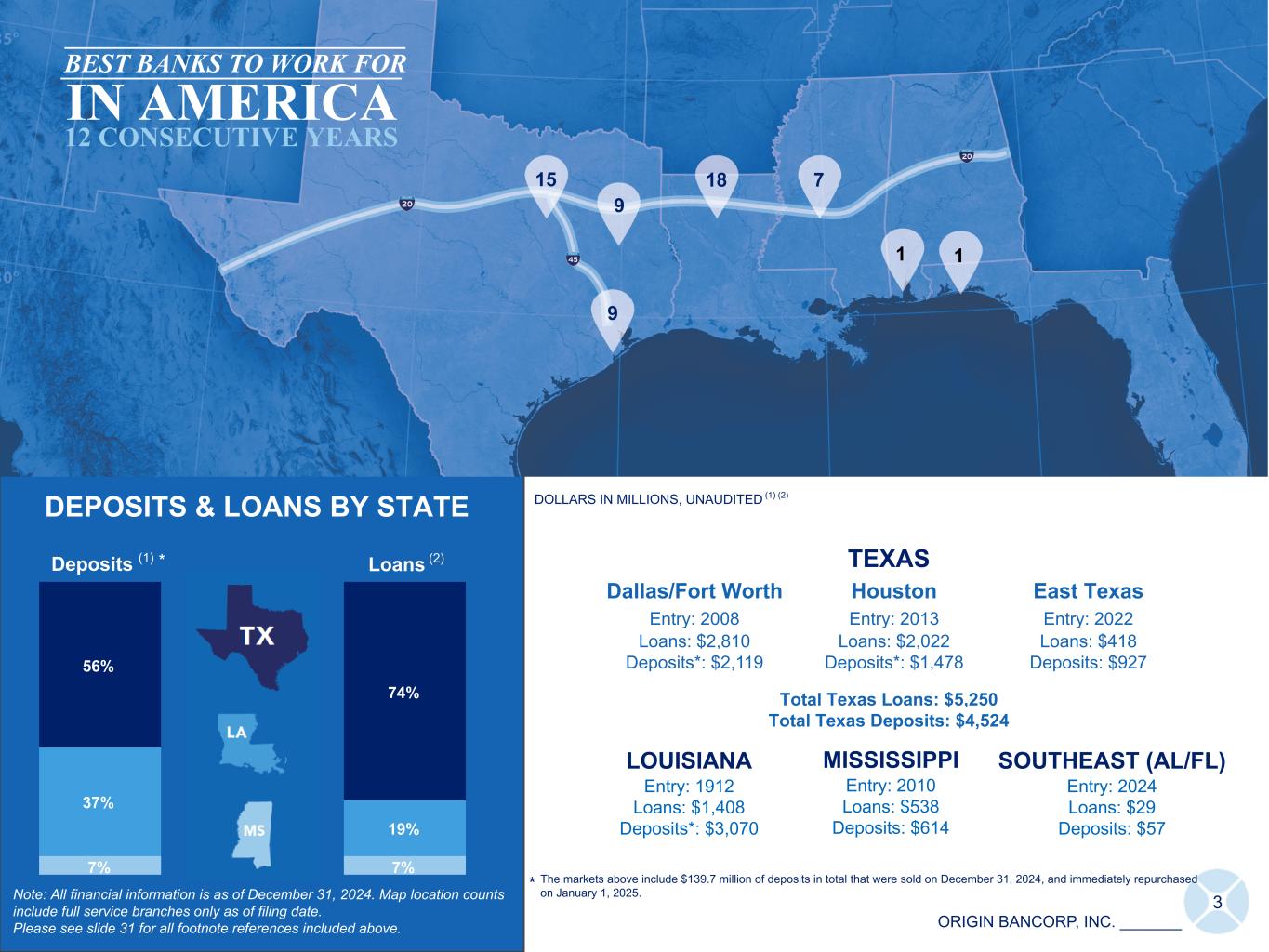 2 FORWARD-LOOKING STATEMENTS AND NON-GAAP MEASURES This presentation contains certain forward-looking statements within the meaning of the Private Securities Litigation Reform Act of 1995. Forward-looking statements include information regarding Origin Bancorp, Inc’s (“Origin”, “we”, “our” or the “Company”) future financial performance, business and growth strategies, projected plans and objectives, and any expected purchases of its outstanding common stock, and related transactions and other projections based on macroeconomic and industry trends, including changes to interest rates by the Federal Reserve and the resulting impact on Origin’s results of operations, estimated forbearance amounts and expectations regarding the Company’s liquidity, including in connection with advances obtained from the FHLB, which are all subject to change and may be inherently unreliable due to the multiple factors that impact broader economic and industry trends, and any such changes may be material. Such forward-looking statements are based on various facts and derived utilizing important assumptions and current expectations, estimates and projections about Origin and its subsidiaries, any of which may change over time and some of which may be beyond Origin’s control. Statements or statistics preceded by, followed by or that otherwise include the words “assumes,” “anticipates,” “believes,” “estimates,” “expects,” “foresees,” “intends,” “plans,” “projects,” and similar expressions or future or conditional verbs such as “could,” “may,” “might,” “should,” “will,” and “would” and variations of such terms are generally forward-looking in nature and not historical facts, although not all forward-looking statements include the foregoing words. Further, certain factors that could affect Origin’s future results and cause actual results to differ materially from those expressed in the forward- looking statements include, but are not limited to: (1) the impact of current and future economic conditions generally and in the financial services industry, nationally and within Origin’s primary market areas, as well as the financial stress on borrowers and changes to customer and client behavior as a result of the foregoing; (2) changes in benchmark interest rates and the resulting impacts on net interest income; (3) deterioration of Origin’s asset quality; (4) factors that can impact the performance of Origin’s loan portfolio, including real estate values and liquidity in Origin’s primary market areas; (5) the financial health of Origin’s commercial borrowers and the success of construction projects that Origin finances; (6) changes in the value of collateral securing Origin’s loans; (7) the impact of generative artificial intelligence; (8) Origin’s ability to anticipate interest rate changes and manage interest rate risk; (9) the impact of heightened regulatory requirements, reduced debit interchange and overdraft income and the possibility of facing related adverse business consequences if our total assets grow in excess of $10 billion as of December 31 of any calendar year; (10) the effectiveness of Origin’s risk management framework and quantitative models; (11) Origin’s inability to receive dividends from Origin Bank and to service debt, pay dividends to Origin’s common stockholders, repurchase Origin’s shares of common stock and satisfy obligations as they become due; (12) the impact of labor pressures; (13) changes in Origin’s operation or expansion strategy or Origin’s ability to prudently manage its growth and execute its strategy; (14) changes in management personnel; (15) Origin’s ability to maintain important customer relationships, reputation or otherwise avoid liquidity risks; (16) increasing costs as Origin grows deposits; (17) operational risks associated with Origin’s business; (18) significant turbulence or a disruption in the capital or financial markets and the effect of market disruption and interest rate volatility on our investment securities; (19) increased competition in the financial services industry, particularly from regional and national institutions, as well as from fintech companies; (20) compliance with governmental and regulatory requirements and changes in laws, rules, regulations, interpretations or policies relating to financial institutions; (21) periodic changes to the extensive body of accounting rules and best practices; (22) further government intervention in the U.S. financial system; (23) a deterioration of the credit rating for U.S. long-term sovereign debt; (24) Origin’s ability to comply with applicable capital and liquidity requirements, including its ability to generate liquidity internally or raise capital on favorable terms, including continued access to the debt and equity capital markets; (25) natural disasters and other adverse weather events, pandemics, acts of terrorism, war, and other matters beyond Origin’s control; (26) developments in our mortgage banking business, including loan modifications, general demand, and the effects of judicial or regulatory requirements or guidance; (27) fraud or misconduct by internal or external actors (including Origin employees); (28) cybersecurity threats or security breaches and the cost of defending against them; (29) Origin’s ability to maintain adequate internal controls over financial and non-financial reporting; and (30) potential claims, damages, penalties, fines, costs and reputational damage resulting from pending or future litigation, regulatory proceedings and enforcement actions. For a discussion of these and other risks that may cause actual results to differ from expectations, please refer to the sections titled “Cautionary Note Regarding Forward-Looking Statements” and “Risk Factors” in Origin’s most recent Annual Report on Form 10-K filed with the Securities and Exchange Commission a