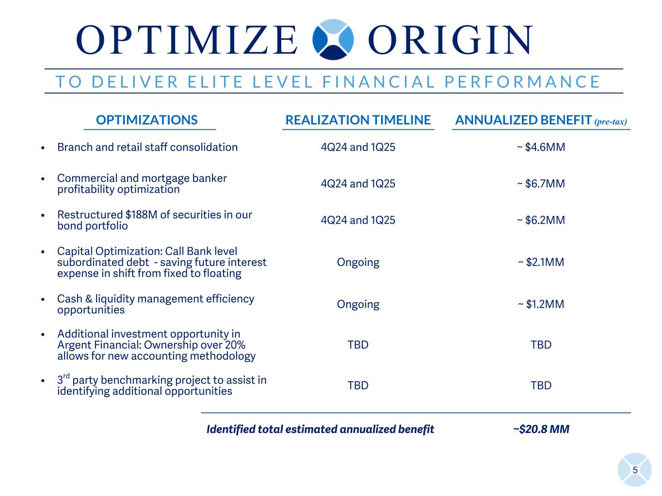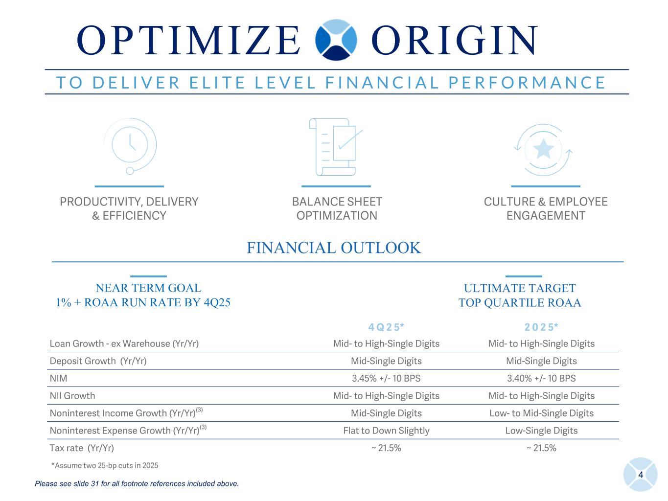 4 T O D E L I V E R E L I T E L E V E L F I N A N C I A L P E R F O R M A N C E T O D E L I V E R E L I T E L E V E L F I N A N C I A L P E R F O R M A N C E PRODUCTIVITY, DELIVERY & EFFICIENCY BALANCE SHEET OPTIMIZATION CULTURE & EMPLOYEE ENGAGEMENT FINANCIAL OUTLOOK 4 Q 2 5* 2 0 2 5* Loan Growth - ex Warehouse (Yr/Yr) Mid- to High-Single Digits Mid- to High-Single Digits Deposit Growth (Yr/Yr) Mid-Single Digits Mid-Single Digits NIM 3.45% +/- 10 BPS 3.40% +/- 10 BPS NII Growth Mid- to High-Single Digits Mid- to High-Single Digits Noninterest Income Growth (Yr/Yr)(3) Mid-Single Digits Low- to Mid-Single Digits Noninterest Expense Growth (Yr/Yr)(3) Flat to Down Slightly Low-Single Digits Tax rate (Yr/Yr) ~ 21.5% ~ 21.5% *Assume two 25-bp cuts in 2025 NEAR TERM GOAL 1% + ROAA RUN RATE BY 4Q25 ULTIMATE TARGET TOP QUARTILE ROAA O P T I M I Z E O R I G I N Please see slide 31 for all footnote references included above.