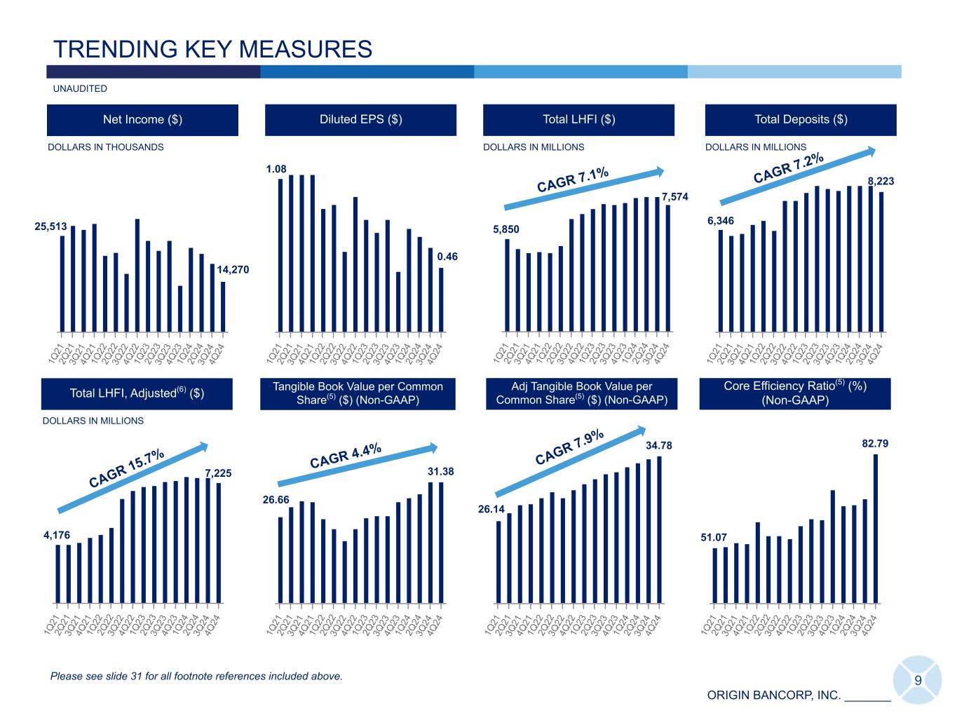 ORIGIN BANCORP, INC. _______ • Optimize Origin - Our newly announced initiative to drive elite financial performance and enhance our award- winning culture. • Our NIM-FTE increased 15 bps for 4Q24, compared to 3Q24. This was driven primarily by a 40 bp reduction in rates paid on interest-bearing liabilities, offset by an 18 bp decline in our yield on interest-earning assets. • Net interest income was $78.3 million for 4Q24, reflecting an increase of $3.5 million, or 4.7%, compared to 3Q24 and is at its highest level in two years. • Provision for credit loss benefit was $5.4 million at 4Q24, compared to a provision for credit loss expense of $4.6 million in 3Q24. • Our bond portfolio optimization strategy, aimed at enhancing long-term yields and improving overall portfolio performance, positively impacted our NIM-FTE by 3 bps for 4Q24, and is estimated to provide a total annual positive impact to NIM-FTE of 7 bps. We sold AFS investment securities with a book value of $188.2 million and realized a loss of $14.6 million, which negatively impacted our diluted EPS by $0.37 for 4Q24. Key Performance Metrics 4Q24 3Q24 B al an ce S he et Total Loans Held for Investment ("LHFI") $ 7,573,713 $ 7,956,790 Total Assets 9,678,702 9,965,986 Total Deposits 8,223,120 8,486,568 In co m e St at em en t Net Income $ 14,270 $ 18,601 Pre-Tax, Pre-Provision ("PTPP") Earnings(5) 12,597 28,272 Diluted EPS 0.46 0.60 Se le ct ed R at io s NIM - FTE 3.33 % 3.18 % Return on Average Assets (annualized) ("ROAA") 0.57 0.74 PTPP ROAA (annualized)(5) 0.50 1.13 Return on Average Stockholders’ Equity (annualized) ("ROAE") 4.94 6.57 Book Value per Common Share $ 36.71 $ 36.76 Tangible Book Value per Common Share(5) 31.38 31.37 Adjusted Tangible Book Value per Common Share(5) 34.78 34.39 Tangible Common Equity to Tangible Assets(5) 10.29 % 9.98 % Return on Average Tangible Common Equity (annualized) ("ROATCE")(5) 5.78 7.74 Efficiency Ratio 83.85 68.86 Core Efficiency Ratio(5) 82.79 67.48 ALCL to Total LHFI 1.20 1.21 DOLLARS IN THOUSANDS, EXCEPT PER SHARE AMOUNTS UNAUDITED 8 PERFORMANCE HIGHLIGHTS AT-A-GLANCE - FOURTH QUARTER 2024 4Q24 Key Highlights Please see slide 31 for all footnote references included above.