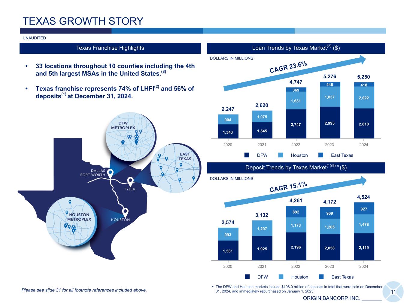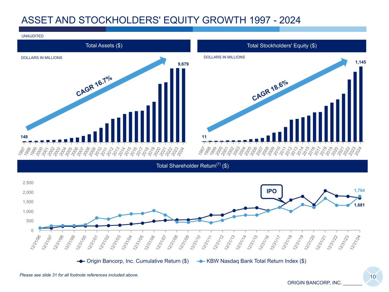 ORIGIN BANCORP, INC. _______ ASSET AND STOCKHOLDERS' EQUITY GROWTH 1997 - 2024 DOLLARS IN MILLIONS Total Assets ($) 148 9,679 19 97 19 98 19 99 20 00 20 01 20 02 20 03 20 04 20 05 20 06 20 07 20 08 20 09 20 10 20 11 20 12 20 13 20 14 20 15 20 16 20 17 20 18 20 19 20 20 20 21 20 22 20 23 20 24 Total Stockholders' Equity ($) 11 1,145 19 97 19 98 19 99 20 00 20 01 20 02 20 03 20 04 20 05 20 06 20 07 20 08 20 09 20 10 20 11 20 12 20 13 20 14 20 15 20 16 20 17 20 18 20 19 20 20 20 21 20 22 20 23 20 24 CAGR 16.7% CAGR 18.6% 10 1,681 1,764 Origin Bancorp, Inc. Cumulative Return ($) KBW Nasdaq Bank Total Return Index ($) 12 /3 1/ 96 12 /3 1/ 97 12 /3 1/ 98 12 /3 1/ 99 12 /3 1/ 00 12 /3 1/ 01 12 /3 1/ 02 12 /3 1/ 03 12 /3 1/ 04 12 /3 1/ 05 12 /3 1/ 06 12 /3 1/ 07 12 /3 1/ 08 12 /3 1/ 09 12 /3 1/ 10 12 /3 1/ 11 12 /3 1/ 12 12 /3 1/ 13 12 /3 1/ 14 12 /3 1/ 15 12 /3 1/ 16 12 /3 1/ 17 12 /3 1/ 18 12 /3 1/ 19 12 /3 1/ 20 12 /3 1/ 21 12 /3 1/ 22 12 /3 1/ 23 12 /3 1/ 24 0 500 1,000 1,500 2,000 2,500 Total Shareholder Return(7) ($) IPO Please see slide 31 for all footnote references included above. DOLLARS IN MILLIONS UNAUDITED