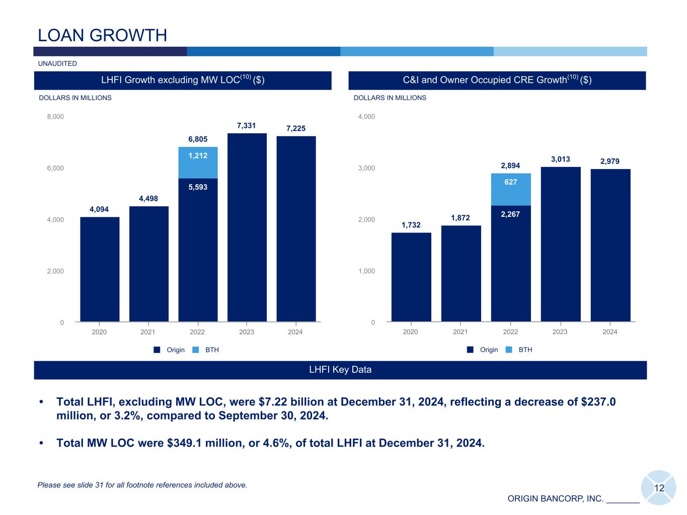 ORIGIN BANCORP, INC. _______ 11 2,247 2,620 4,747 5,276 5,250 1,343 1,545 2,747 2,993 2,810 904 1,075 1,631 1,837 2,022 369 446 418 DFW Houston East Texas 2020 2021 2022 2023 2024 Deposit Trends by Texas Market(1)(9) ($) Loan Trends by Texas Market(2) ($) TEXAS GROWTH STORY Texas Franchise Highlights DOLLARS IN MILLIONS • 33 locations throughout 10 counties including the 4th and 5th largest MSAs in the United States.(8) • Texas franchise represents 74% of LHFI(2) and 56% of deposits(1) at December 31, 2024. 2,574 3,132 4,261 4,172 4,524 1,581 1,925 2,196 2,058 2,119 993 1,207 1,173 1,205 1,478 892 909 927 DFW Houston East Texas 2020 2021 2022 2023 2024 CAGR 23.6% CAGR 15.1% Please see slide 31 for all footnote references included above. DOLLARS IN MILLIONS UNAUDITED * The DFW and Houston markets include $108.0 million of deposits in total that were sold on December 31, 2024, and immediately repurchased on January 1, 2025. *