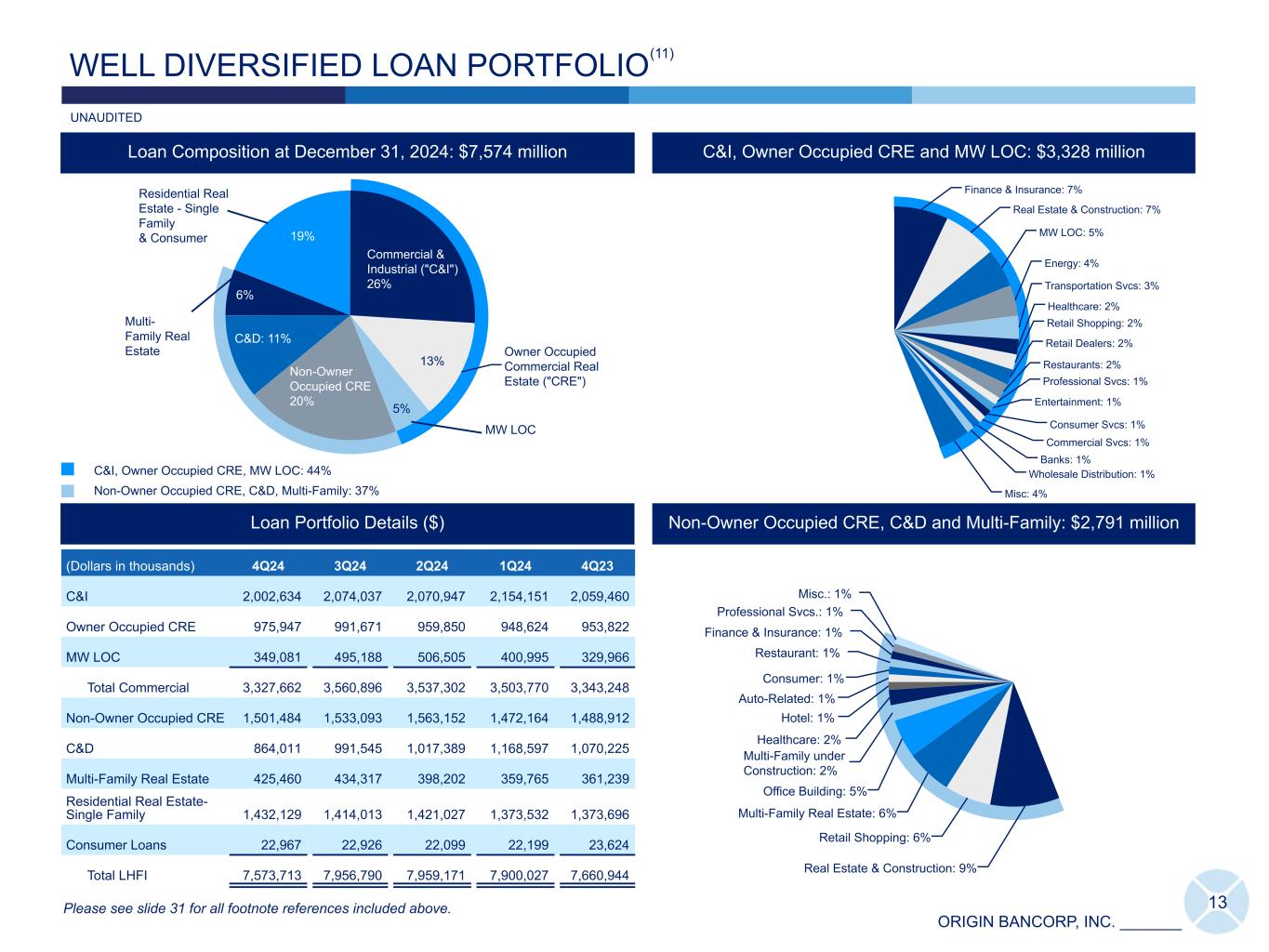 ORIGIN BANCORP, INC. _______ 12 LOAN GROWTH 4,094 4,498 6,805 7,331 7,225 4,094 4,498 5,593 7,331 7,225 1,212 Origin BTH 2020 2021 2022 2023 2024 0 2,000 4,000 6,000 8,000 LHFI Key Data DOLLARS IN MILLIONS IDT • Total LHFI, excluding MW LOC, were $7.22 billion at December 31, 2024, reflecting a decrease of $237.0 million, or 3.2%, compared to September 30, 2024. • Total MW LOC were $349.1 million, or 4.6%, of total LHFI at December 31, 2024. LHFI Growth excluding MW LOC(10) ($) 1,732 1,872 2,894 3,013 2,979 1,732 1,872 2,267 3,013 2,979627 Origin BTH 2020 2021 2022 2023 2024 0 1,000 2,000 3,000 4,000 C&I and Owner Occupied CRE Growth(10) ($) Please see slide 31 for all footnote references included above. DOLLARS IN MILLIONS UNAUDITED