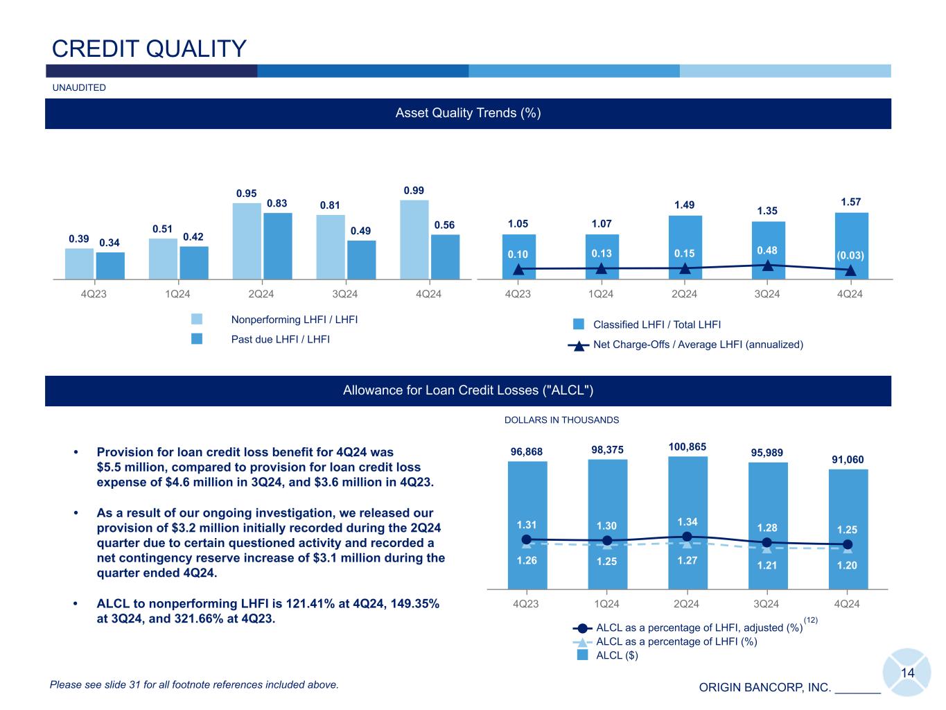 ORIGIN BANCORP, INC. _______ Commercial & Industrial ("C&I") 26% Owner Occupied Commercial Real Estate ("CRE") Non-Owner Occupied CRE 20% C&D: 11% Multi- Family Real Estate Residential Real Estate - Single Family & Consumer Real Estate & Construction: 9% Retail Shopping: 6% Multi-Family Real Estate: 6% Office Building: 5% Multi-Family under Construction: 2% Healthcare: 2% Hotel: 1% Auto-Related: 1% Consumer: 1% Restaurant: 1% Finance & Insurance: 1% Professional Svcs.: 1% Misc.: 1% Finance & Insurance: 7% Real Estate & Construction: 7% MW LOC: 5% Energy: 4% Transportation Svcs: 3% Healthcare: 2% Retail Shopping: 2% Retail Dealers: 2% Restaurants: 2% Professional Svcs: 1% Entertainment: 1% Consumer Svcs: 1% Commercial Svcs: 1% Banks: 1% Wholesale Distribution: 1% Misc: 4% 13 WELL DIVERSIFIED LOAN PORTFOLIO (Dollars in thousands) 4Q24 3Q24 2Q24 1Q24 4Q23 C&I 2,002,634 2,074,037 2,070,947 2,154,151 2,059,460 Owner Occupied CRE 975,947 991,671 959,850 948,624 953,822 MW LOC 349,081 495,188 506,505 400,995 329,966 Total Commercial 3,327,662 3,560,896 3,537,302 3,503,770 3,343,248 Non-Owner Occupied CRE 1,501,484 1,533,093 1,563,152 1,472,164 1,488,912 C&D 864,011 991,545 1,017,389 1,168,597 1,070,225 Multi-Family Real Estate 425,460 434,317 398,202 359,765 361,239 Residential Real Estate- Single Family 1,432,129 1,414,013 1,421,027 1,373,532 1,373,696 Consumer Loans 22,967 22,926 22,099 22,199 23,624 Total LHFI 7,573,713 7,956,790 7,959,171 7,900,027 7,660,944 Loan Portfolio Details ($) Non-Owner Occupied CRE, C&D and Multi-Family: $2,791 million C&I, Owner Occupied CRE and MW LOC: $3,328 million C&I, Owner Occupied CRE, MW LOC: 44% Non-Owner Occupied CRE, C&D, Multi-Family: 37% Loan Composition at December 31, 2024: $7,574 million Please see slide 31 for all footnote references included above. UNAUDITED (11) MW LOC 6% 19% 13% 5%