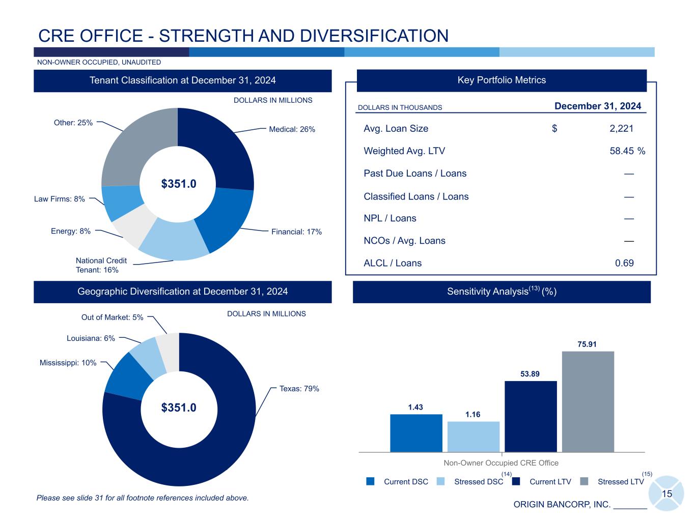 ORIGIN BANCORP, INC. _______ 1.05 1.07 1.49 1.35 1.57 0.10 0.13 0.15 0.48 (0.03) Classified LHFI / Total LHFI Net Charge-Offs / Average LHFI (annualized) 4Q23 1Q24 2Q24 3Q24 4Q24 0.39 0.51 0.95 0.81 0.99 0.34 0.42 0.83 0.49 0.56 Nonperforming LHFI / LHFI Past due LHFI / LHFI 4Q23 1Q24 2Q24 3Q24 4Q24 14 CREDIT QUALITY Asset Quality Trends (%) Allowance for Loan Credit Losses ("ALCL") 96,868 98,375 100,865 95,989 91,060 1.26 1.25 1.27 1.21 1.20 1.31 1.30 1.34 1.28 1.25 ALCL as a percentage of LHFI, adjusted (%) ALCL as a percentage of LHFI (%) ALCL ($) 4Q23 1Q24 2Q24 3Q24 4Q24 • Provision for loan credit loss benefit for 4Q24 was $5.5 million, compared to provision for loan credit loss expense of $4.6 million in 3Q24, and $3.6 million in 4Q23. • As a result of our ongoing investigation, we released our provision of $3.2 million initially recorded during the 2Q24 quarter due to certain questioned activity and recorded a net contingency reserve increase of $3.1 million during the quarter ended 4Q24. • ALCL to nonperforming LHFI is 121.41% at 4Q24, 149.35% at 3Q24, and 321.66% at 4Q23. DOLLARS IN THOUSANDS (12) Please see slide 31 for all footnote references included above. UNAUDITED