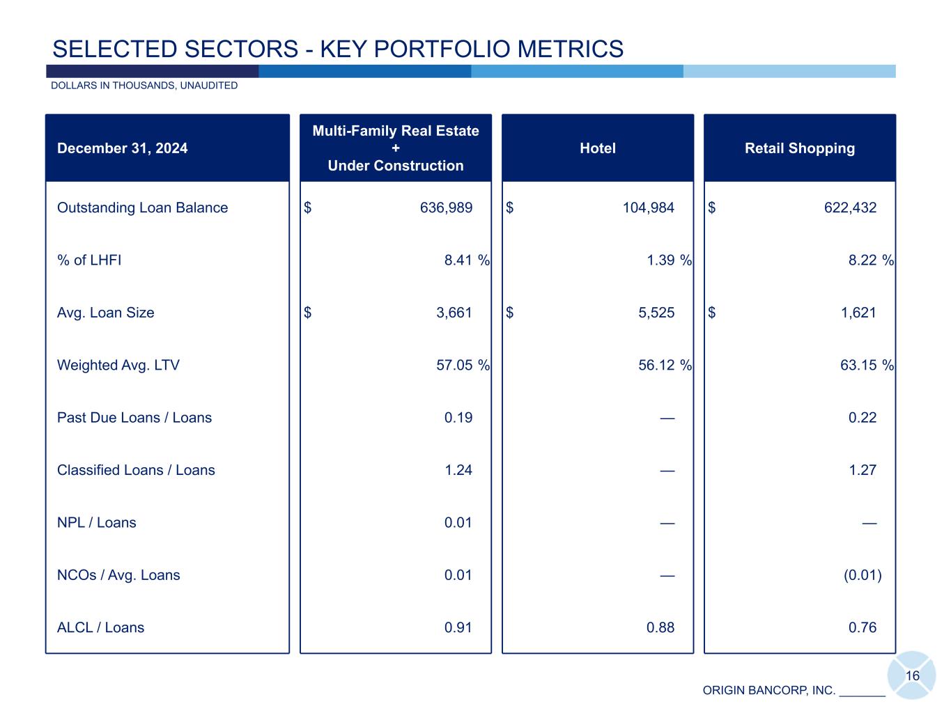ORIGIN BANCORP, INC. _______ Texas: 79% Mississippi: 10% Louisiana: 6% Out of Market: 5% 15 Medical: 26% Financial: 17% National Credit Tenant: 16% Energy: 8% Law Firms: 8% Other: 25% CRE OFFICE - STRENGTH AND DIVERSIFICATION Tenant Classification at December 31, 2024 $351.0 $351.0 Geographic Diversification at December 31, 2024 DOLLARS IN THOUSANDS December 31, 2024 Avg. Loan Size $ 2,221 Weighted Avg. LTV 58.45 % Past Due Loans / Loans — Classified Loans / Loans — NPL / Loans — NCOs / Avg. Loans — ALCL / Loans 0.69 Key Portfolio Metrics DOLLARS IN MILLIONS DOLLARS IN MILLIONS NON-OWNER OCCUPIED, UNAUDITED Sensitivity Analysis(13) (%) 1.43 1.16 53.89 75.91 Current DSC Stressed DSC Current LTV Stressed LTV Non-Owner Occupied CRE Office (14) Please see slide 31 for all footnote references included above. (15)