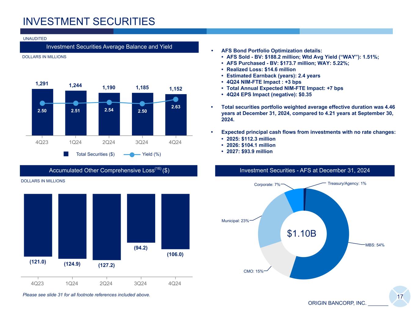 ORIGIN BANCORP, INC. _______ Treasury/Agency: 1% MBS: 54% CMO: 15% Municipal: 23% Corporate: 7% 1,291 1,244 1,190 1,185 1,152 2.50 2.51 2.54 2.50 2.63 Total Securities ($) Yield (%) 4Q23 1Q24 2Q24 3Q24 4Q24 Investment Securities Average Balance and Yield INVESTMENT SECURITIES DOLLARS IN MILLIONS • AFS Bond Portfolio Optimization details: • AFS Sold - BV: $188.2 million; Wtd Avg Yield (“WAY”): 1.51%; • AFS Purchased - BV: $173.7 million; WAY: 5.22%; • Realized Loss: $14.6 million • Estimated Earnback (years): 2.4 years • 4Q24 NIM-FTE Impact : +3 bps • Total Annual Expected NIM-FTE Impact: +7 bps • 4Q24 EPS Impact (negative): $0.35 • Total securities portfolio weighted average effective duration was 4.46 years at December 31, 2024, compared to 4.21 years at September 30, 2024. • Expected principal cash flows from investments with no rate changes: • 2025: $112.3 million • 2026: $104.1 million • 2027: $93.9 million 17 (121.0) (124.9) (127.2) (94.2) (106.0) 4Q23 1Q24 2Q24 3Q24 4Q24 Accumulated Other Comprehensive Loss(16) ($) Investment Securities - AFS at December 31, 2024 Please see slide 31 for all footnote references included above. $1.10B DOLLARS IN MILLIONS UNAUDITED