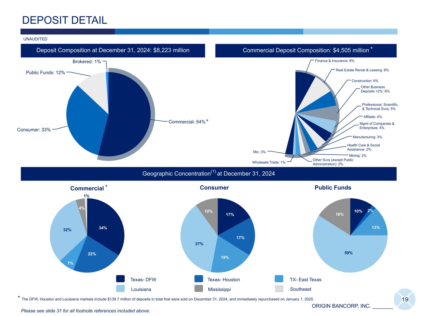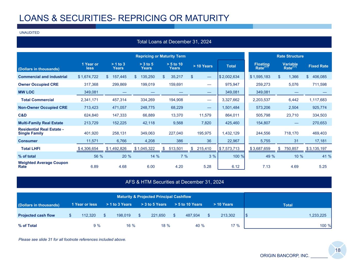ORIGIN BANCORP, INC. _______ Total Loans at December 31, 2024 (Dollars in thousands) Repricing or Maturity Term Rate Structure 1 Year or less > 1 to 3 Years > 3 to 5 Years > 5 to 10 Years > 10 Years Total Floating Rate(17) Variable Rate(17) Fixed Rate Commercial and industrial $ 1,674,722 $ 157,445 $ 135,250 $ 35,217 $ — $ 2,002,634 $ 1,595,183 $ 1,366 $ 406,085 Owner Occupied CRE 317,368 299,869 199,019 159,691 — 975,947 259,273 5,076 711,598 MW LOC 349,081 — — — — 349,081 349,081 — — Total Commercial 2,341,171 457,314 334,269 194,908 — 3,327,662 2,203,537 6,442 1,117,683 Non-Owner Occupied CRE 713,423 471,057 248,775 68,229 — 1,501,484 573,206 2,504 925,774 C&D 624,840 147,333 66,889 13,370 11,579 864,011 505,798 23,710 334,503 Multi-Family Real Estate 213,729 152,225 42,118 9,568 7,820 425,460 154,807 — 270,653 Residential Real Estate - Single Family 401,920 258,131 349,063 227,040 195,975 1,432,129 244,556 718,170 469,403 Consumer 11,571 6,766 4,208 386 36 22,967 5,755 31 17,181 Total LHFI $ 4,306,654 $ 1,492,826 $ 1,045,322 $ 513,501 $ 215,410 $ 7,573,713 $ 3,687,659 $ 750,857 $ 3,135,197 % of total 56 % 20 % 14 % 7 % 3 % 100 % 49 % 10 % 41 % Weighted Average Coupon Rate 6.89 4.68 6.00 4.20 5.28 6.12 7.13 4.69 5.25 AFS & HTM Securities at December 31, 2024 (Dollars in thousands) Maturity & Projected Principal Cashflow Total1 Year or less > 1 to 3 Years > 3 to 5 Years > 5 to 10 Years > 10 Years Projected cash flow $ 112,320 $ 198,019 $ 221,650 $ 487,934 $ 213,302 $ 1,233,225 % of Total 9 % 16 % 18 % 40 % 17 % 100 % LOANS & SECURITIES- REPRICING OR MATURITY 18 UNAUDITED Please see slide 31 for all footnote references included above.