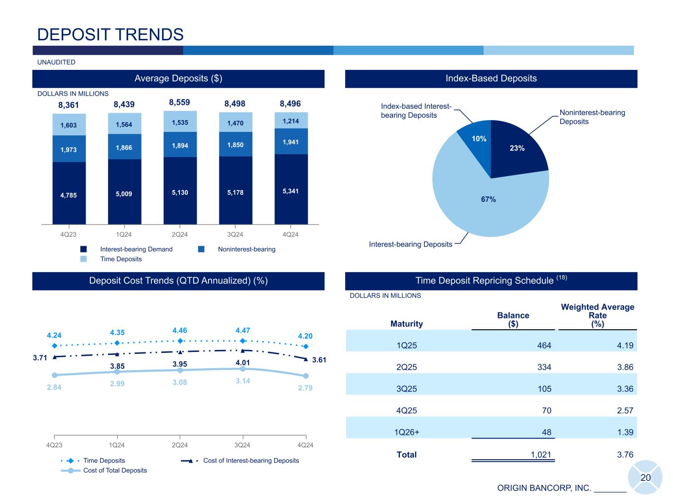 ORIGIN BANCORP, INC. _______ Commercial: 54% Consumer: 33% Public Funds: 12% Brokered: 1% 34% 22% 7% 32% 4% 1% 10% 2% 13% 59% 16% Finance & Insurance: 8% Real Estate Rental & Leasing: 8% Construction: 6% Other Business Deposits <2%: 6% Professional, Scientific, & Technical Svcs: 5% Affiliate: 4% Mgmt of Companies & Enterprises: 4% Manufacturing: 3% Health Care & Social Assistance: 2% Mining: 2% Other Svcs (except Public Administration): 2%Wholesale Trade: 1% Mic: 3% 19 DEPOSIT DETAIL (Dollars in thousands) 4Q24 3Q24 2Q24 1Q24 4Q23 QoQ % Δ Total Deposits $ 8,223,120 $ 8,486,568 $ 8,510,842 $ 8,505,464 $ 8,251,125 (3.1) % FDIC Insured (3,464,116) (3,464,116) (3,442,636) (3,447,538) (3,425,268) — FDIC Insured Reciprocal (1,093,952) (1,093,952) (799,221) (801,145) (801,699) — FDIC Insured Brokered Deposits (431,609) (431,609) (636,814) (597,110) (444,989) — Total Estimated FDIC Uninsured Deposits 3,233,443 3,496,891 3,632,171 3,659,671 3,579,169 (7.5) Collateralized Public Funds (714,431) (714,431) (771,419) (836,150) (849,603) — Uninsured/ Uncollateralized Deposits ($) $ 2,519,012 $ 2,782,460 $ 2,860,752 $ 2,823,521 $ 2,729,566 (9.5) Uninsured/ Uncollateralized Deposits (%) 30.6 % 32.8 % 33.6 % 33.2 % 33.1 % Deposit Detail Geographic Concentration(1) at December 31, 2024 Commercial Deposit Composition: $4,505 million Deposit Composition at December 31, 2024: $8,223 million Commercial Public FundsConsumer MississippiLouisiana Texas- DFW TX- East TexasTexas- Houston Please see slide 31 for all footnote references included above. UNAUDITED Southeast 17% 17% 19% 37% 10% * The DFW, Houston and Louisiana markets include $139.7 million of deposits in total that were sold on December 31, 2024, and immediately repurchased on January 1, 2025. * * *
