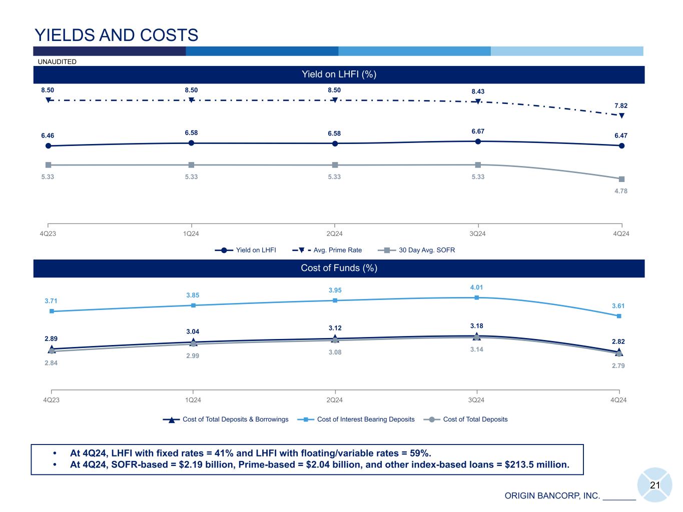 ORIGIN BANCORP, INC. _______ 20 8,361 8,439 8,559 8,498 8,496 4,785 5,009 5,130 5,178 5,341 1,973 1,866 1,894 1,850 1,941 1,603 1,564 1,535 1,470 1,214 Interest-bearing Demand Noninterest-bearing Time Deposits 4Q23 1Q24 2Q24 3Q24 4Q24 Average Deposits ($) DEPOSIT TRENDS IDT Index-Based Deposits DOLLARS IN MILLIONS UNAUDITED Deposit Cost Trends (QTD Annualized) (%) 4.24 4.35 4.46 4.47 4.20 3.71 3.85 3.95 4.01 3.61 2.84 2.99 3.08 3.14 2.79 Time Deposits Cost of Interest-bearing Deposits Cost of Total Deposits 4Q23 1Q24 2Q24 3Q24 4Q24 Time Deposit Repricing Schedule (18) Maturity Balance ($) Weighted Average Rate (%) 1Q25 464 4.19 2Q25 334 3.86 3Q25 105 3.36 4Q25 70 2.57 1Q26+ 48 1.39 Total 1,021 3.76 DOLLARS IN MILLIONS Noninterest-bearing Deposits Interest-bearing Deposits Index-based Interest- bearing Deposits 10% 67% 23%