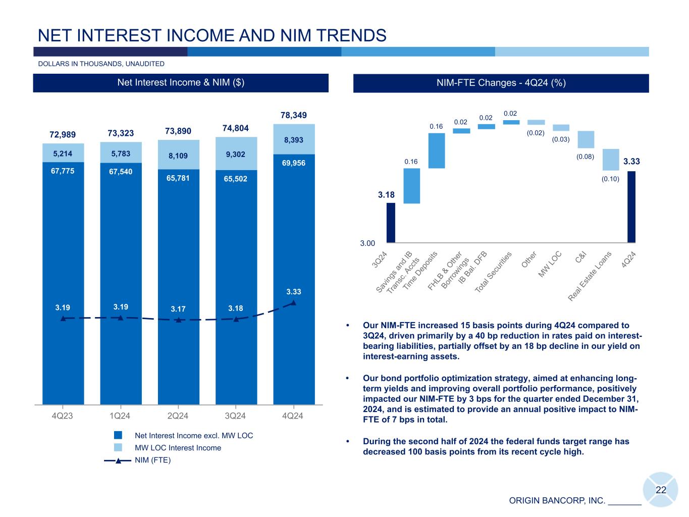 ORIGIN BANCORP, INC. _______ 72,989 73,323 73,890 74,804 78,349 67,775 67,540 65,781 65,502 69,956 5,214 5,783 8,109 9,302 8,393 3.19 3.19 3.17 3.18 3.33 Net Interest Income excl. MW LOC MW LOC Interest Income NIM (FTE) 4Q23 1Q24 2Q24 3Q24 4Q24 22 DOLLARS IN THOUSANDS, UNAUDITED NET INTEREST INCOME AND NIM TRENDS 3.18 0.16 0.16 0.02 0.02 0.02 (0.02) (0.03) (0.08) (0.10) 3Q 24 Sav ing s a nd IB Tr an sc . A cc ts Tim e D ep os its FH LB & O the r Bor ro wing s IB B al. D FB To tal S ec ur itie s Othe r MW LO C C&I Rea l E sta te Lo an s 4Q 24 3.00 24.64 29.52 21.01 8.58 2.04 2.480.12 0.77 2.18 3.65 4.99 5.26 5.33 4.65 Cumulative NIM-FTE Beta Average Quarterly Fed Funds Rate 1Q22 2Q22 3Q22 4Q22 2Q23 3Q23 4Q23 1Q24 4Q24 NIM Beta - 4Q24 (%) 1.54 2.48 4.51 NIM-FTE Changes - 4Q24 (%) NIM-FTE Changes - 4Q24 (%) 73,32372,989 1,362 1,537 568 432 (298) (3,267) 4Q 23 RE Lo an s C&I MW LO C Othe r FH LB & O the r Bor ro wing s Sav ing s & IB Tr an sa c. Acc ts. 1Q 24 40,000 60,000 80,000 • Our NIM-FTE increased 15 basis points during 4Q24 compared to 3Q24, driven primarily by a 40 bp reduction in rates paid on interest- bearing liabilities, partially offset by an 18 bp decline in our yield on interest-earning assets. • Our bond portfolio optimization strategy, aimed at enhancing long- term yields and improving overall portfolio performance, positively impacted our NIM-FTE by 3 bps for the quarter ended December 31, 2024, and is estimated to provide an annual positive impact to NIM- FTE of 7 bps in total. • During the second half of 2024 the federal funds target range has decreased 100 basis points from its recent cycle high. Net Interest Income & NIM ($) 3.33