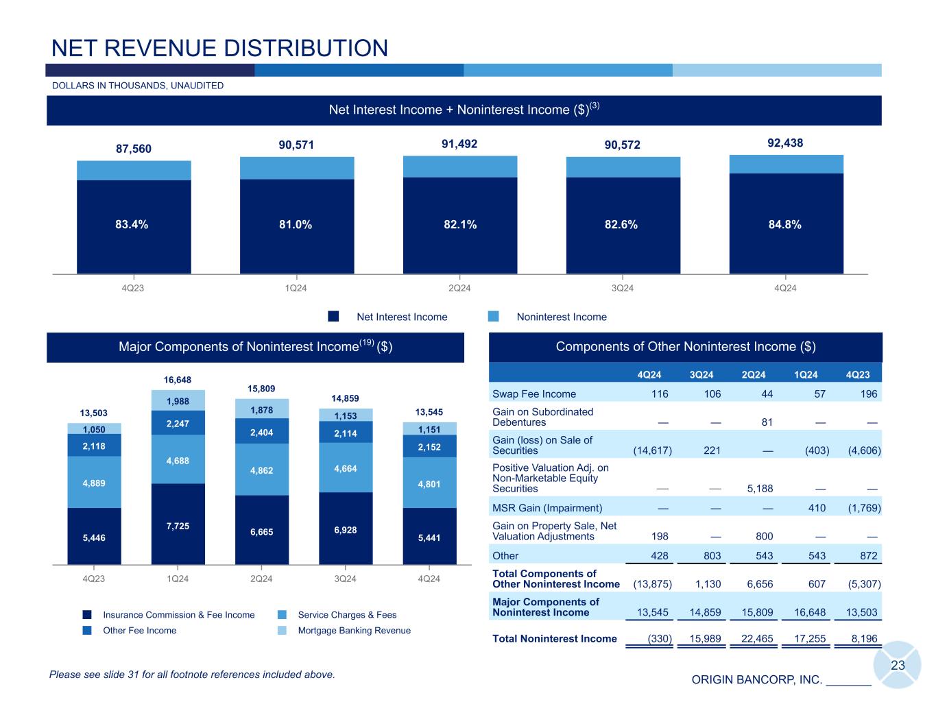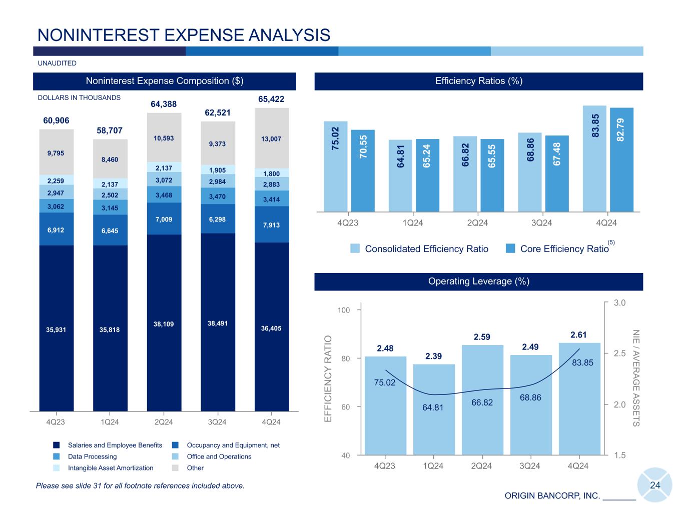 ORIGIN BANCORP, INC. _______ 87,560 90,571 91,492 90,572 92,438 Net Interest Income Noninterest Income 4Q23 1Q24 2Q24 3Q24 4Q24 13,503 16,648 15,809 14,859 13,545 5,446 7,725 6,665 6,928 5,441 4,889 4,688 4,862 4,664 4,801 2,118 2,247 2,404 2,114 2,152 1,050 1,988 1,878 1,153 1,151 Insurance Commission & Fee Income Service Charges & Fees Other Fee Income Mortgage Banking Revenue 4Q23 1Q24 2Q24 3Q24 4Q24 23 Major Components of Noninterest Income(19) ($) Net Interest Income + Noninterest Income ($)(3) NET REVENUE DISTRIBUTION Components of Other Noninterest Income ($) 4Q24 3Q24 2Q24 1Q24 4Q23 Swap Fee Income 116 106 44 57 196 Gain on Subordinated Debentures — — 81 — — Gain (loss) on Sale of Securities (14,617) 221 — (403) (4,606) Positive Valuation Adj. on Non-Marketable Equity Securities — — 5,188 — — MSR Gain (Impairment) — — — 410 (1,769) Gain on Property Sale, Net Valuation Adjustments 198 — 800 — — Other 428 803 543 543 872 Total Components of Other Noninterest Income (13,875) 1,130 6,656 607 (5,307) Major Components of Noninterest Income 13,545 14,859 15,809 16,648 13,503 Total Noninterest Income (330) 15,989 22,465 17,255 8,196 83.4% 84.8% Please see slide 31 for all footnote references included above. DOLLARS IN THOUSANDS, UNAUDITED 82.6%82.1%81.0%