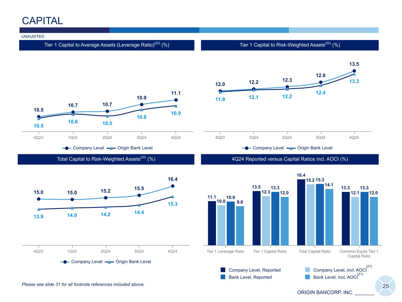 ORIGIN BANCORP, INC. _______ 24 Efficiency Ratios (%) NONINTEREST EXPENSE ANALYSIS DOLLARS IN THOUSANDS Noninterest Expense Composition ($) Consolidated Efficiency Ratio Core Efficiency Ratio 4Q23 1Q24 2Q24 3Q24 4Q24 Operating Leverage (%) E FF IC IE N C Y R AT IO N IE / AV E R A G E A S S E TS 2.48 2.39 2.59 2.49 2.61 75.02 64.81 66.82 68.86 4Q23 1Q24 2Q24 3Q24 4Q24 40 60 80 100 1.5 2.0 2.5 3.0 75 .0 2 70 .5 5 65 .2 4 64 .8 1 Please see slide 31 for all footnote references included above. 65 .5 5 83 .8 5 (5) UNAUDITED 82 .7 9 66 .8 2 68 .8 6 67 .4 8 60,906 58,707 64,388 62,521 65,422 35,931 35,818 38,109 38,491 36,405 6,912 6,645 7,009 6,298 7,913 3,062 3,145 3,468 3,470 3,414 2,947 2,502 3,072 2,984 2,8832,259 2,137 2,137 1,905 1,800 9,795 8,460 10,593 9,373 13,007 Salaries and Employee Benefits Occupancy and Equipment, net Data Processing Office and Operations Intangible Asset Amortization Other 4Q23 1Q24 2Q24 3Q24 4Q24 83.85
