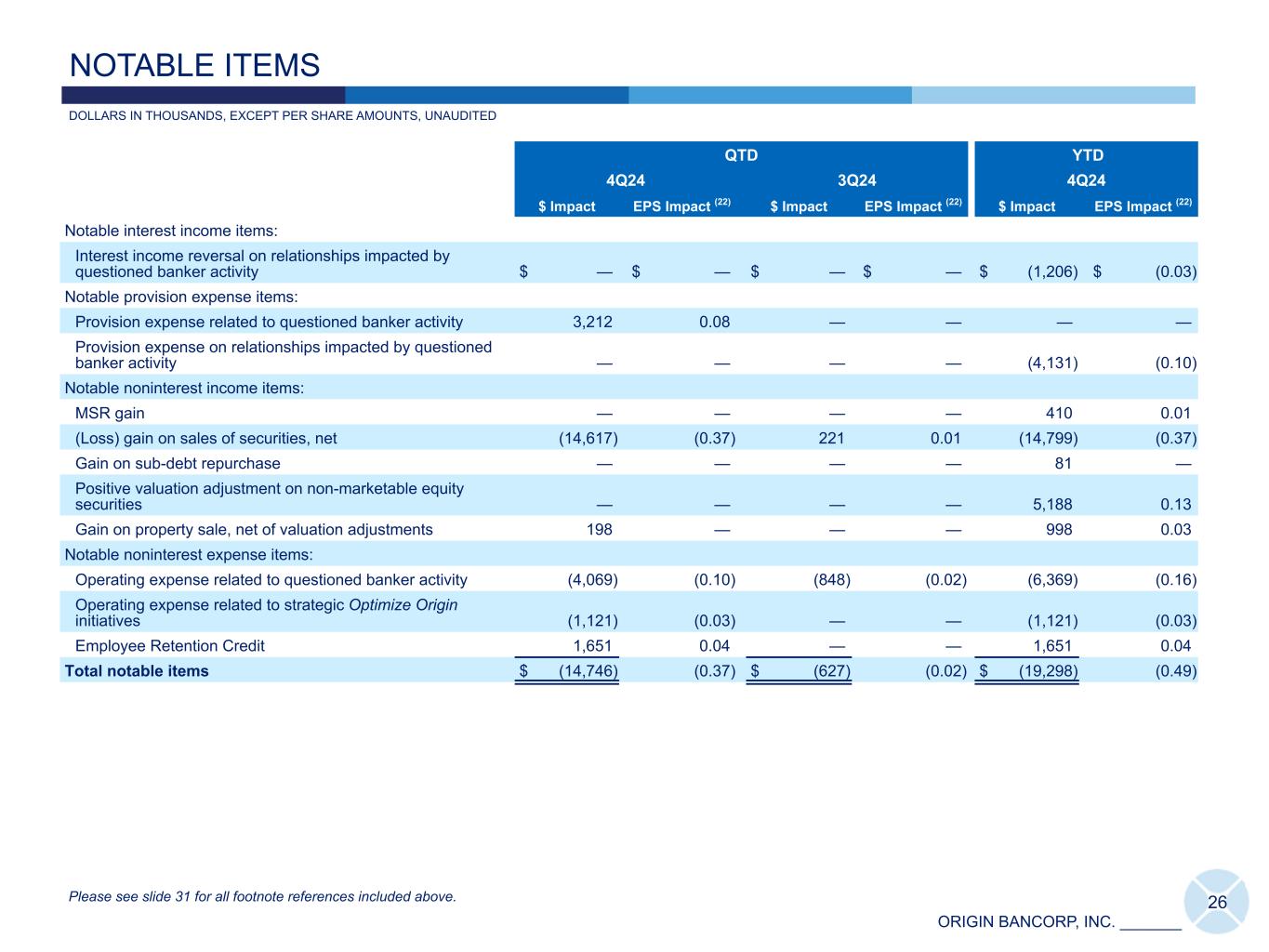 ORIGIN BANCORP, INC. _______ QTD YTD 4Q24 3Q24 4Q24 $ Impact EPS Impact (22) $ Impact EPS Impact (22) $ Impact EPS Impact (22) Notable interest income items: Interest income reversal on relationships impacted by questioned banker activity $ — $ — $ — $ — $ (1,206) $ (0.03) Notable provision expense items: Provision expense related to questioned banker activity 3,212 0.08 — — — — Provision expense on relationships impacted by questioned banker activity — — — — (4,131) (0.10) Notable noninterest income items: MSR gain — — — — 410 0.01 (Loss) gain on sales of securities, net (14,617) (0.37) 221 0.01 (14,799) (0.37) Gain on sub-debt repurchase — — — — 81 — Positive valuation adjustment on non-marketable equity securities — — — — 5,188 0.13 Gain on property sale, net of valuation adjustments 198 — — — 998 0.03 Notable noninterest expense items: Operating expense related to questioned banker activity (4,069) (0.10) (848) (0.02) (6,369) (0.16) Operating expense related to strategic Optimize Origin initiatives (1,121) (0.03) — — (1,121) (0.03) Employee Retention Credit 1,651 0.04 — — 1,651 0.04 Total notable items $ (14,746) (0.37) $ (627) (0.02) $ (19,298) (0.49) 26 DOLLARS IN THOUSANDS, EXCEPT PER SHARE AMOUNTS, UNAUDITED NOTABLE ITEMS Please see slide 31 for all footnote references included above.