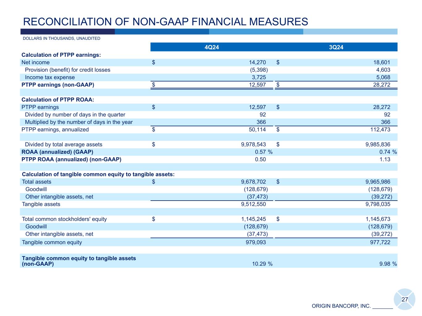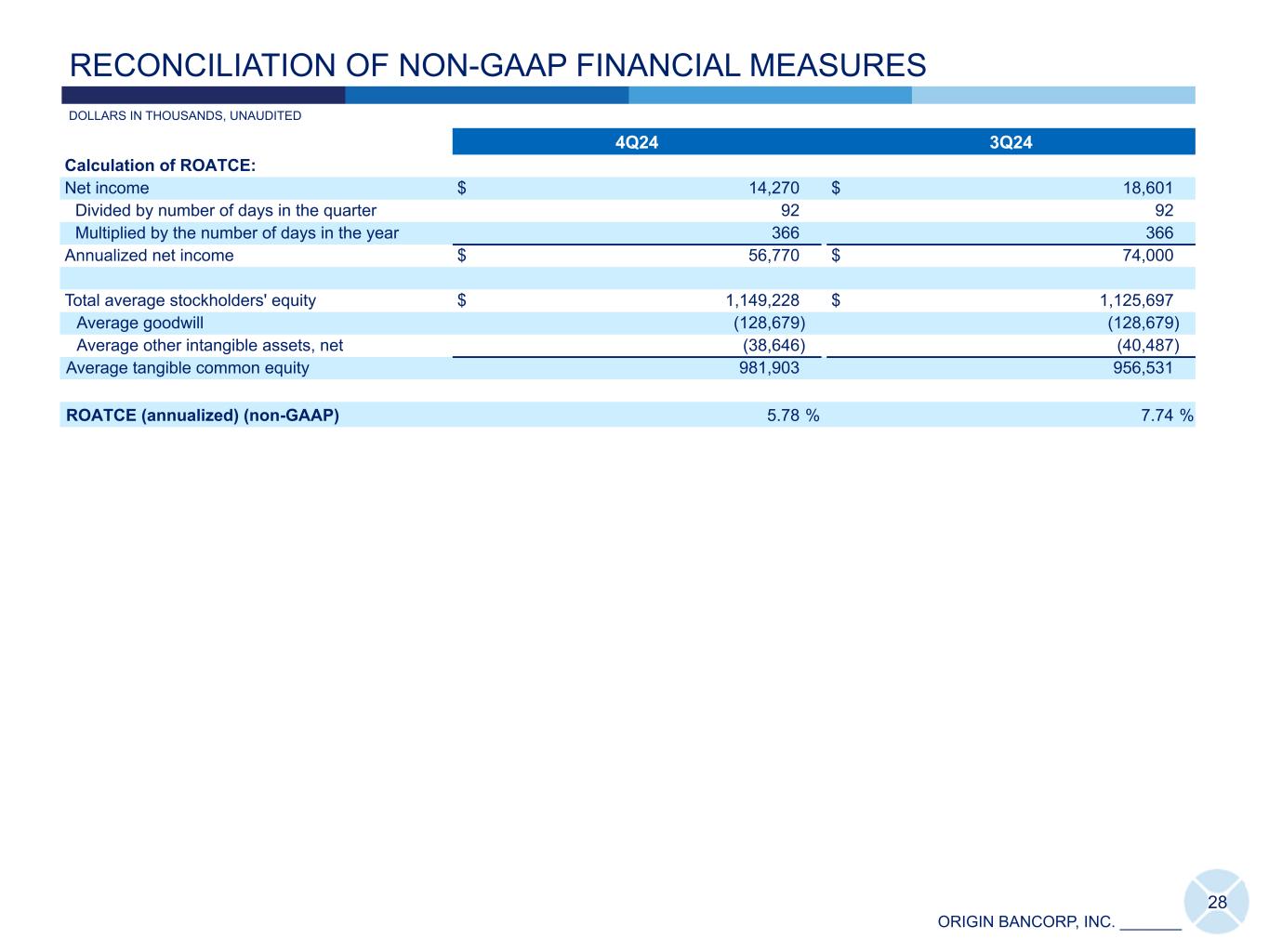 ORIGIN BANCORP, INC. _______ 4Q24 3Q24 Calculation of PTPP earnings: Net income $ 14,270 $ 18,601 Provision (benefit) for credit losses (5,398) 4,603 Income tax expense 3,725 5,068 PTPP earnings (non-GAAP) $ 12,597 $ 28,272 Calculation of PTPP ROAA: PTPP earnings $ 12,597 $ 28,272 Divided by number of days in the quarter 92 92 Multiplied by the number of days in the year 366 366 PTPP earnings, annualized $ 50,114 $ 112,473 Divided by total average assets $ 9,978,543 $ 9,985,836 ROAA (annualized) (GAAP) 0.57 % 0.74 % PTPP ROAA (annualized) (non-GAAP) 0.50 1.13 Calculation of tangible common equity to tangible assets: Total assets $ 9,678,702 $ 9,965,986 Goodwill (128,679) (128,679) Other intangible assets, net (37,473) (39,272) Tangible assets 9,512,550 9,798,035 Total common stockholders' equity $ 1,145,245 $ 1,145,673 Goodwill (128,679) (128,679) Other intangible assets, net (37,473) (39,272) Tangible common equity 979,093 977,722 Tangible common equity to tangible assets (non-GAAP) 10.29 % 9.98 % 27 DOLLARS IN THOUSANDS, UNAUDITED RECONCILIATION OF NON-GAAP FINANCIAL MEASURES