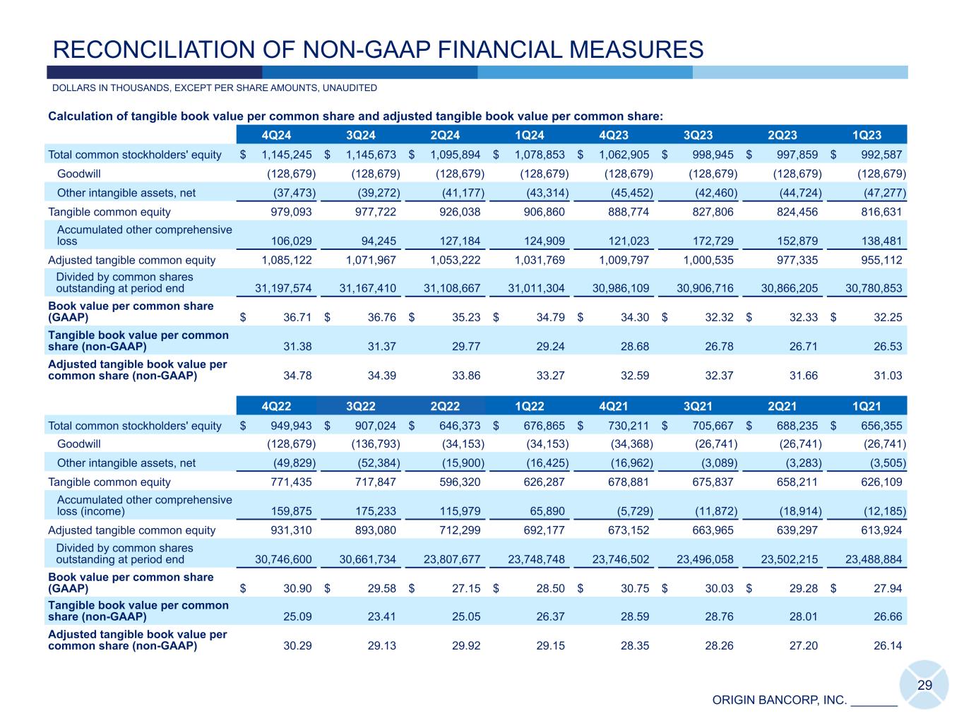 ORIGIN BANCORP, INC. _______ 4Q24 3Q24 Calculation of ROATCE: Net income $ 14,270 $ 18,601 Divided by number of days in the quarter 92 92 Multiplied by the number of days in the year 366 366 Annualized net income $ 56,770 $ 74,000 Total average stockholders' equity $ 1,149,228 $ 1,125,697 Average goodwill (128,679) (128,679) Average other intangible assets, net (38,646) (40,487) Average tangible common equity 981,903 956,531 ROATCE (annualized) (non-GAAP) 5.78 % 7.74 % 28 DOLLARS IN THOUSANDS, UNAUDITED RECONCILIATION OF NON-GAAP FINANCIAL MEASURES