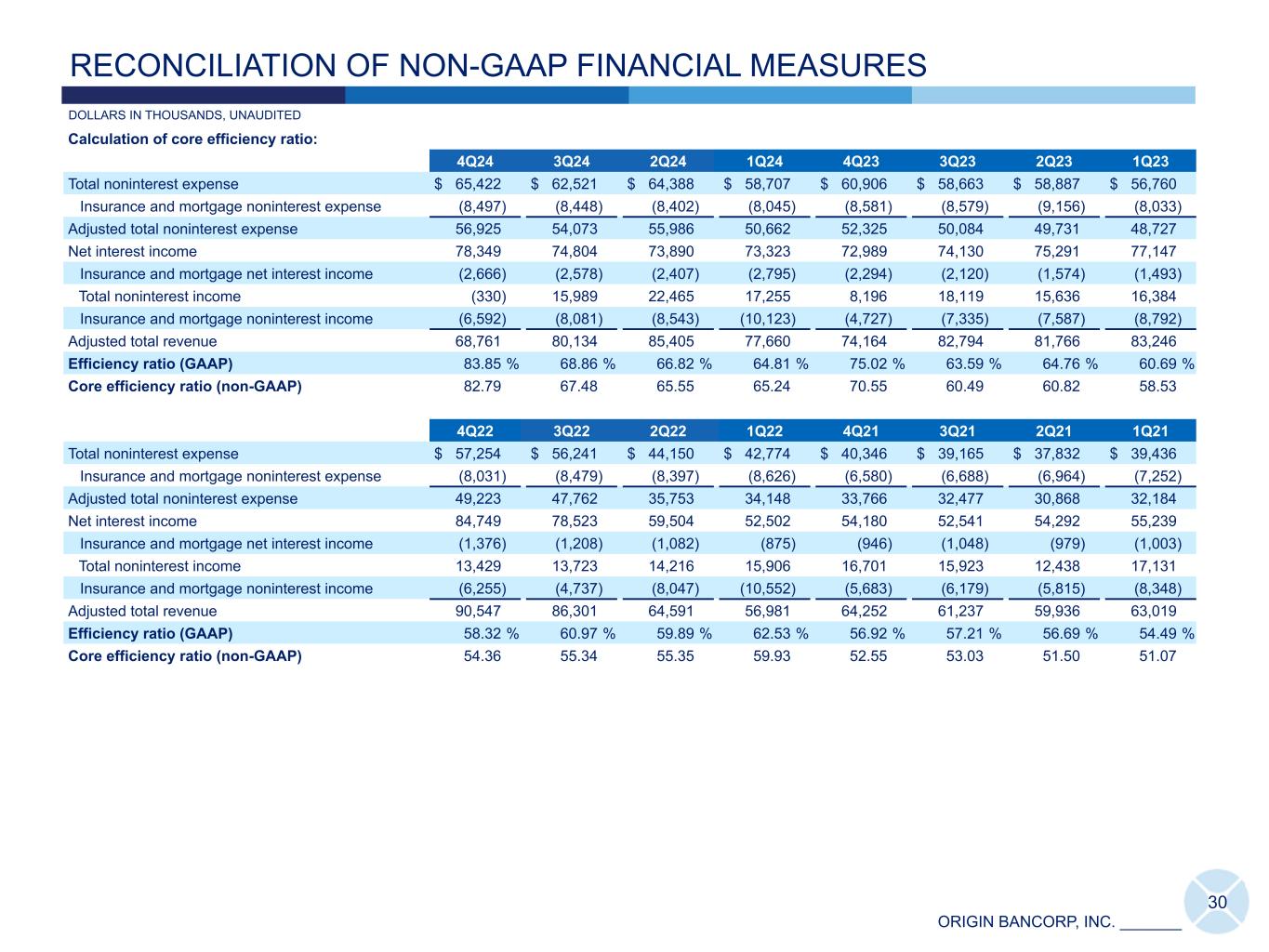 ORIGIN BANCORP, INC. _______ RECONCILIATION OF NON-GAAP FINANCIAL MEASURES DOLLARS IN THOUSANDS, UNAUDITED Calculation of core efficiency ratio: 4Q24 3Q24 2Q24 1Q24 4Q23 3Q23 2Q23 1Q23 Total noninterest expense $ 65,422 $ 62,521 $ 64,388 $ 58,707 $ 60,906 $ 58,663 $ 58,887 $ 56,760 Insurance and mortgage noninterest expense (8,497) (8,448) (8,402) (8,045) (8,581) (8,579) (9,156) (8,033) Adjusted total noninterest expense 56,925 54,073 55,986 50,662 52,325 50,084 49,731 48,727 Net interest income 78,349 74,804 73,890 73,323 72,989 74,130 75,291 77,147 Insurance and mortgage net interest income (2,666) (2,578) (2,407) (2,795) (2,294) (2,120) (1,574) (1,493) Total noninterest income (330) 15,989 22,465 17,255 8,196 18,119 15,636 16,384 Insurance and mortgage noninterest income (6,592) (8,081) (8,543) (10,123) (4,727) (7,335) (7,587) (8,792) Adjusted total revenue 68,761 80,134 85,405 77,660 74,164 82,794 81,766 83,246 Efficiency ratio (GAAP) 83.85 % 68.86 % 66.82 % 64.81 % 75.02 % 63.59 % 64.76 % 60.69 % Core efficiency ratio (non-GAAP) 82.79 67.48 65.55 65.24 70.55 60.49 60.82 58.53 4Q22 3Q22 2Q22 1Q22 4Q21 3Q21 2Q21 1Q21 Total noninterest expense $ 57,254 $ 56,241 $ 44,150 $ 42,774 $ 40,346 $ 39,165 $ 37,832 $ 39,436 Insurance and mortgage noninterest expense (8,031) (8,479) (8,397) (8,626) (6,580) (6,688) (6,964) (7,252) Adjusted total noninterest expense 49,223 47,762 35,753 34,148 33,766 32,477 30,868 32,184 Net interest income 84,749 78,523 59,504 52,502 54,180 52,541 54,292 55,239 Insurance and mortgage net interest income (1,376) (1,208) (1,082) (875) (946) (1,048) (979) (1,003) Total noninterest income 13,429 13,723 14,216 15,906 16,701 15,923 12,438 17,131 Insurance and mortgage noninterest income (6,255) (4,737) (8,047) (10,552) (5,683) (6,179) (5,815) (8,348) Adjusted total revenue 90,547 86,301 64,591 56,981 64,252 61,237 59,936 63,019 Efficiency ratio (GAAP) 58.32 % 60.97 % 59.89 % 62.53 % 56.92 % 57.21 % 56.69 % 54.49 % Core efficiency ratio (non-GAAP) 54.36 55.34 55.35 59.93 52.55 53.03 51.50 51.07 30