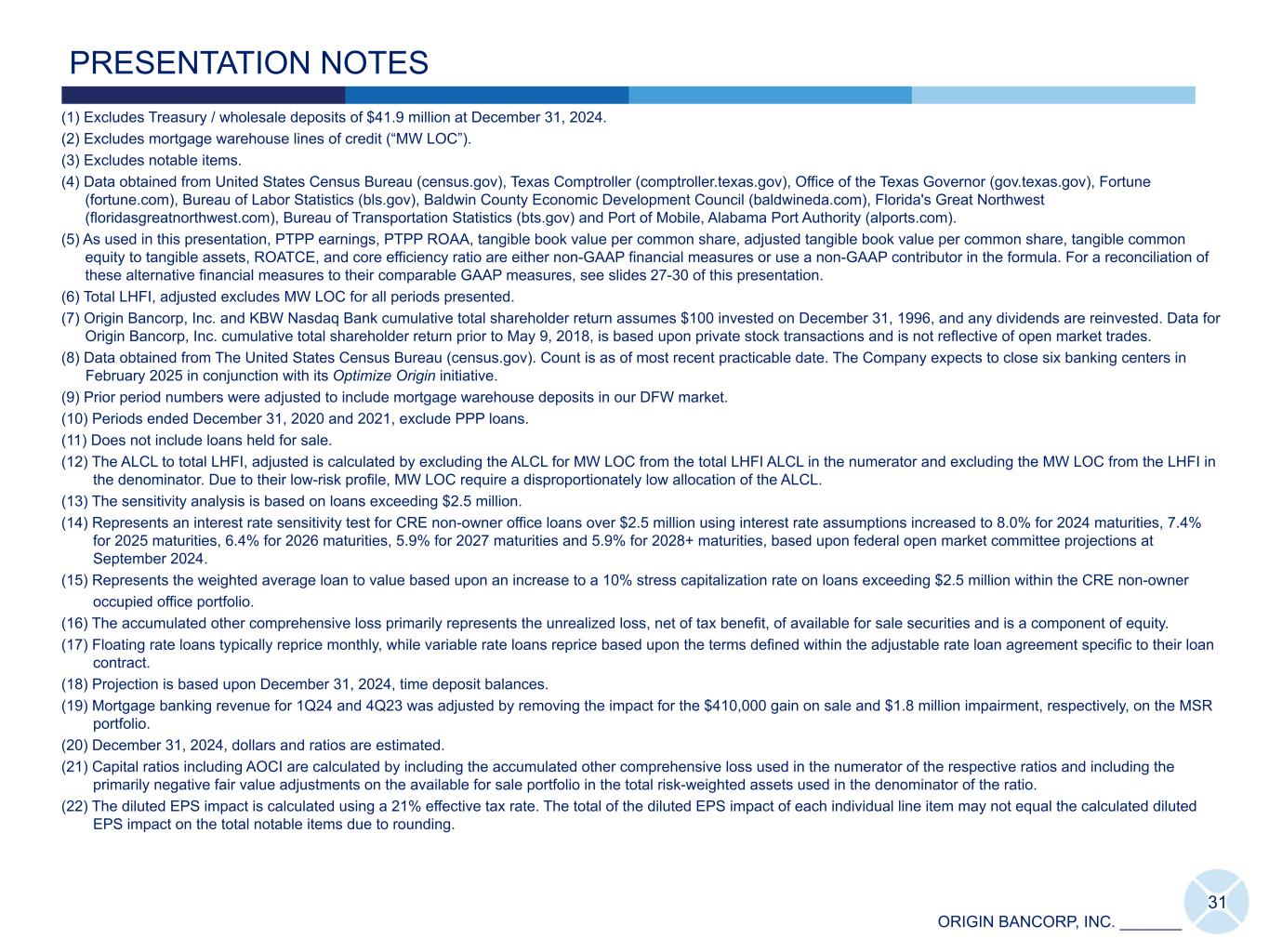 ORIGIN BANCORP, INC. _______ 31 PRESENTATION NOTES (1) Excludes Treasury / wholesale deposits of $41.9 million at December 31, 2024. (2) Excludes mortgage warehouse lines of credit (“MW LOC”). (3) Excludes notable items. (4) Data obtained from United States Census Bureau (census.gov), Texas Comptroller (comptroller.texas.gov), Office of the Texas Governor (gov.texas.gov), Fortune (fortune.com), Bureau of Labor Statistics (bls.gov), Baldwin County Economic Development Council (baldwineda.com), Florida's Great Northwest (floridasgreatnorthwest.com), Bureau of Transportation Statistics (bts.gov) and Port of Mobile, Alabama Port Authority (alports.com). (5) As used in this presentation, PTPP earnings, PTPP ROAA, tangible book value per common share, adjusted tangible book value per common share, tangible common equity to tangible assets, ROATCE, and core efficiency ratio are either non-GAAP financial measures or use a non-GAAP contributor in the formula. For a reconciliation of these alternative financial measures to their comparable GAAP measures, see slides 27-30 of this presentation. (6) Total LHFI, adjusted excludes MW LOC for all periods presented. (7) Origin Bancorp, Inc. and KBW Nasdaq Bank cumulative total shareholder return assumes $100 invested on December 31, 1996, and any dividends are reinvested. Data for Origin Bancorp, Inc. cumulative total shareholder return prior to May 9, 2018, is based upon private stock transactions and is not reflective of open market trades. (8) Data obtained from The United States Census Bureau (census.gov). Count is as of most recent practicable date. The Company expects to close six banking centers in February 2025 in conjunction with its Optimize Origin initiative. (9) Prior period numbers were adjusted to include mortgage warehouse deposits in our DFW market. (10) Periods ended December 31, 2020 and 2021, exclude PPP loans. (11) Does not include loans held for sale. (12) The ALCL to total LHFI, adjusted is calculated by excluding the ALCL for MW LOC from the total LHFI ALCL in the numerator and excluding the MW LOC from the LHFI in the denominator. Due to their low-risk profile, MW LOC require a disproportionately low allocation of the ALCL. (13) The sensitivity analysis is based on loans exceeding $2.5 million. (14) Represents an interest rate sensitivity test for CRE non-owner office loans over $2.5 million using interest rate assumptions increased to 8.0% for 2024 maturities, 7.4% for 2025 maturities, 6.4% for 2026 maturities, 5.9% for 2027 maturities and 5.9% for 2028+ maturities, based upon federal open market committee projections at September 2024. (15) Represents the weighted average loan to value based upon an increase to a 10% stress capitalization rate on loans exceeding $2.5 million within the CRE non-owner occupied office portfolio. (16) The accumulated other comprehensive loss primarily represents the unrealized loss, net of tax benefit, of available for sale securities and is a component of equity. (17) Floating rate loans typically reprice monthly, while variable rate loans reprice based upon the terms defined within the adjustable rate loan agreement specific to their loan contract. (18) Projection is based upon December 31, 2024, time deposit balances. (19) Mortgage banking revenue for 1Q24 and 4Q23 was adjusted by removing the impact for the $410,000 gain on sale and $1.8 million impairment, respectively, on the MSR portfolio. (20) December 31, 2024, dollars and ratios are estimated. (21) Capital ratios including AOCI are calculated by including the accumulated other comprehensive loss used in the numerator of the respective ratios and including the primarily negative fair value adjustments on the available for sale portfolio in the total risk-weighted assets used in the denominator of the ratio. (22) The diluted EPS impact is calculated using a 21% effective tax rate. The total of the diluted EPS impact of each individual line item may not equal the calculated diluted EPS impact on the total notable items due to rounding.