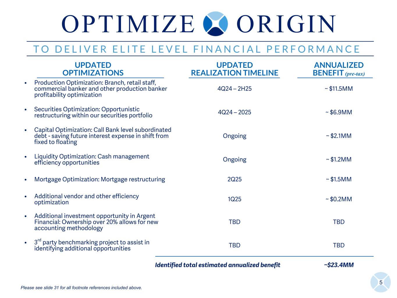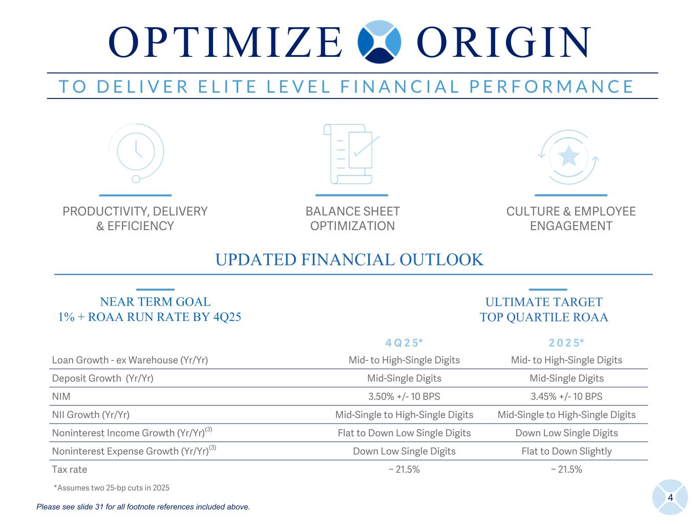 4 T O D E L I V E R E L I T E L E V E L F I N A N C I A L P E R F O R M A N C E T O D E L I V E R E L I T E L E V E L F I N A N C I A L P E R F O R M A N C E PRODUCTIVITY, DELIVERY & EFFICIENCY BALANCE SHEET OPTIMIZATION CULTURE & EMPLOYEE ENGAGEMENT UPDATED FINANCIAL OUTLOOK 4 Q 2 5* 2 0 2 5* Loan Growth - ex Warehouse (Yr/Yr) Mid- to High-Single Digits Mid- to High-Single Digits Deposit Growth (Yr/Yr) Mid-Single Digits Mid-Single Digits NIM 3.50% +/- 10 BPS 3.45% +/- 10 BPS NII Growth (Yr/Yr) Mid-Single to High-Single Digits Mid-Single to High-Single Digits Noninterest Income Growth (Yr/Yr)(3) Flat to Down Low Single Digits Down Low Single Digits Noninterest Expense Growth (Yr/Yr)(3) Down Low Single Digits Flat to Down Slightly Tax rate ~ 21.5% ~ 21.5% *Assumes two 25-bp cuts in 2025 NEAR TERM GOAL 1% + ROAA RUN RATE BY 4Q25 ULTIMATE TARGET TOP QUARTILE ROAA O P T I M I Z E O R I G I N Please see slide 31 for all footnote references included above.