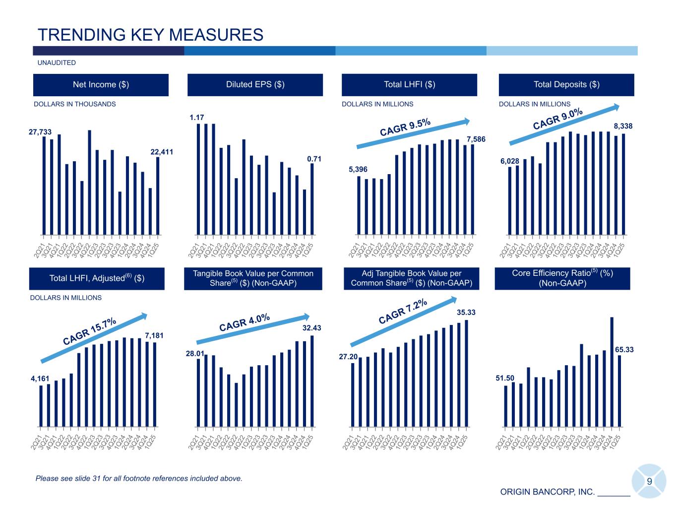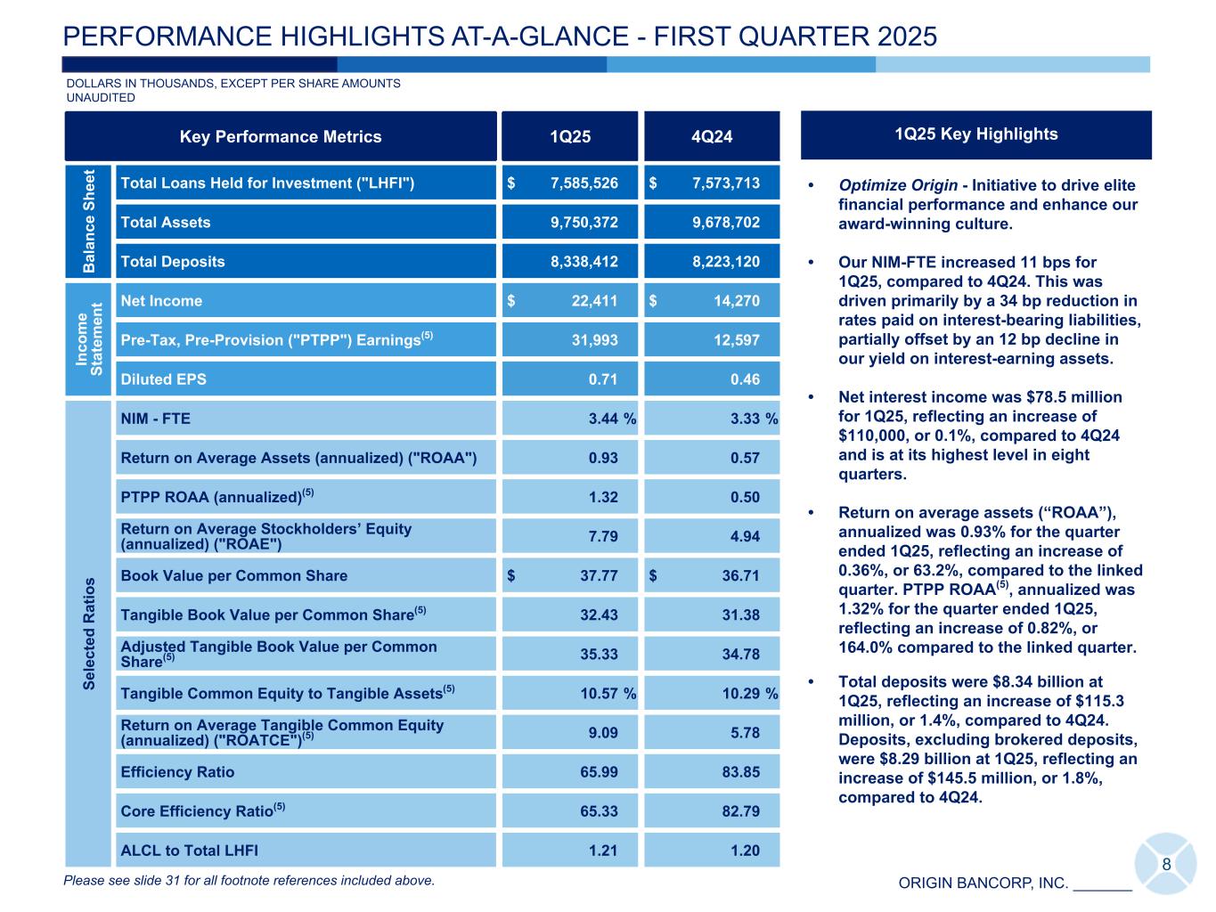 ORIGIN BANCORP, INC. _______ • Optimize Origin - Initiative to drive elite financial performance and enhance our award-winning culture. • Our NIM-FTE increased 11 bps for 1Q25, compared to 4Q24. This was driven primarily by a 34 bp reduction in rates paid on interest-bearing liabilities, partially offset by an 12 bp decline in our yield on interest-earning assets. • Net interest income was $78.5 million for 1Q25, reflecting an increase of $110,000, or 0.1%, compared to 4Q24 and is at its highest level in eight quarters. • Return on average assets (“ROAA”), annualized was 0.93% for the quarter ended 1Q25, reflecting an increase of 0.36%, or 63.2%, compared to the linked quarter. PTPP ROAA(5), annualized was 1.32% for the quarter ended 1Q25, reflecting an increase of 0.82%, or 164.0% compared to the linked quarter. • Total deposits were $8.34 billion at 1Q25, reflecting an increase of $115.3 million, or 1.4%, compared to 4Q24. Deposits, excluding brokered deposits, were $8.29 billion at 1Q25, reflecting an increase of $145.5 million, or 1.8%, compared to 4Q24. Key Performance Metrics 1Q25 4Q24 B al an ce S he et Total Loans Held for Investment ("LHFI") $ 7,585,526 $ 7,573,713 Total Assets 9,750,372 9,678,702 Total Deposits 8,338,412 8,223,120 In co m e St at em en t Net Income $ 22,411 $ 14,270 Pre-Tax, Pre-Provision ("PTPP") Earnings(5) 31,993 12,597 Diluted EPS 0.71 0.46 Se le ct ed R at io s NIM - FTE 3.44 % 3.33 % Return on Average Assets (annualized) ("ROAA") 0.93 0.57 PTPP ROAA (annualized)(5) 1.32 0.50 Return on Average Stockholders’ Equity (annualized) ("ROAE") 7.79 4.94 Book Value per Common Share $ 37.77 $ 36.71 Tangible Book Value per Common Share(5) 32.43 31.38 Adjusted Tangible Book Value per Common Share(5) 35.33 34.78 Tangible Common Equity to Tangible Assets(5) 10.57 % 10.29 % Return on Average Tangible Common Equity (annualized) ("ROATCE")(5) 9.09 5.78 Efficiency Ratio 65.99 83.85 Core Efficiency Ratio(5) 65.33 82.79 ALCL to Total LHFI 1.21 1.20 DOLLARS IN THOUSANDS, EXCEPT PER SHARE AMOUNTS UNAUDITED 8 PERFORMANCE HIGHLIGHTS AT-A-GLANCE - FIRST QUARTER 2025 1Q25 Key Highlights Please see slide 31 for all footnote references included above.