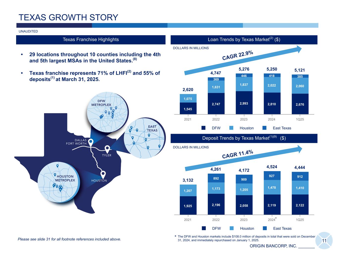 ORIGIN BANCORP, INC. _______ TRENDING KEY MEASURES UNAUDITED Diluted EPS ($)Net Income ($) Total LHFI, Adjusted(6) ($) Total Deposits ($) 2Q 21 3Q 21 4Q 21 1Q 22 2Q 22 3Q 22 4Q 22 1Q 23 2Q 23 3Q 23 4Q 23 1Q 24 2Q 24 3Q 24 4Q 24 1Q 25 2Q 21 3Q 21 4Q 21 1Q 22 2Q 22 3Q 22 4Q 22 1Q 23 2Q 23 3Q 23 4Q 23 1Q 24 2Q 24 3Q 24 4Q 24 1Q 25 8,338 2Q 21 3Q 21 4Q 21 1Q 22 2Q 22 3Q 22 4Q 22 1Q 23 2Q 23 3Q 23 4Q 23 1Q 24 2Q 24 3Q 24 4Q 24 1Q 25 4,161 7,181 2Q 21 3Q 21 4Q 21 1Q 22 2Q 22 3Q 22 4Q 22 1Q 23 2Q 23 3Q 23 4Q 23 1Q 24 2Q 24 3Q 24 4Q 24 1Q 25 DOLLARS IN THOUSANDS 9 Total LHFI ($) DOLLARS IN MILLIONS 5,396 2Q 21 3Q 21 4Q 21 1Q 22 2Q 22 3Q 22 4Q 22 1Q 23 2Q 23 3Q 23 4Q 23 1Q 24 2Q 24 3Q 24 4Q 24 1Q 25 DOLLARS IN MILLIONS DOLLARS IN MILLIONS Please see slide 31 for all footnote references included above. CAGR 9.5% CAGR 15.7% CAGR 9.0% 6,028 27,733 22,411 Core Efficiency Ratio(5) (%) (Non-GAAP) 51.50 2Q 21 3Q 21 4Q 21 1Q 22 2Q 22 3Q 22 4Q 22 1Q 23 2Q 23 3Q 23 4Q 23 1Q 24 2Q 24 3Q 24 4Q 24 1Q 25 32.43 2Q 21 3Q 21 4Q 21 1Q 22 2Q 22 3Q 22 4Q 22 1Q 23 2Q 23 3Q 23 4Q 23 1Q 24 2Q 24 3Q 24 4Q 24 1Q 25 Tangible Book Value per Common Share(5) ($) (Non-GAAP) 35.33 2Q 21 3Q 21 4Q 21 1Q 22 2Q 22 3Q 22 4Q 22 1Q 23 2Q 23 3Q 23 4Q 23 1Q 24 2Q 24 3Q 24 4Q 24 1Q 25 Adj Tangible Book Value per Common Share(5) ($) (Non-GAAP) CAGR 4.0% CAGR 7.2% 1.17 0.71 28.01 27.20 7,586 65.33