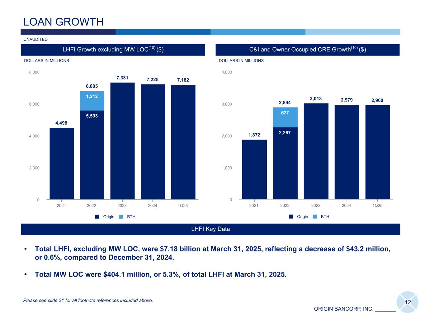 ORIGIN BANCORP, INC. _______ 11 2,620 4,747 5,276 5,250 5,121 1,545 2,747 2,993 2,810 2,676 1,075 1,631 1,837 2,022 2,060 369 446 418 385 DFW Houston East Texas 2021 2022 2023 2024 1Q25 Deposit Trends by Texas Market(1)(9) ($) Loan Trends by Texas Market(2) ($) TEXAS GROWTH STORY Texas Franchise Highlights DOLLARS IN MILLIONS • 29 locations throughout 10 counties including the 4th and 5th largest MSAs in the United States.(8) • Texas franchise represents 71% of LHFI(2) and 55% of deposits(1) at March 31, 2025. 3,132 4,261 4,172 4,524 4,444 1,925 2,196 2,058 2,119 2,122 1,207 1,173 1,205 1,478 1,410 892 909 927 912 DFW Houston East Texas 2021 2022 2023 2024 1Q25 CAGR 22.9% CAGR 11.4% Please see slide 31 for all footnote references included above. DOLLARS IN MILLIONS UNAUDITED * The DFW and Houston markets include $108.0 million of deposits in total that were sold on December 31, 2024, and immediately repurchased on January 1, 2025. *