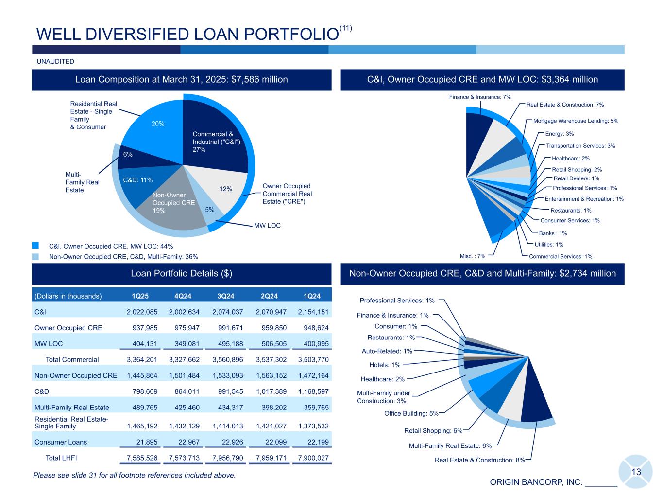 ORIGIN BANCORP, INC. _______ 12 LOAN GROWTH 4,498 6,805 7,331 7,225 7,182 4,498 5,593 7,225 7,182 1,212 Origin BTH 2021 2022 2023 2024 1Q25 0 2,000 4,000 6,000 8,000 LHFI Key Data DOLLARS IN MILLIONS IDT • Total LHFI, excluding MW LOC, were $7.18 billion at March 31, 2025, reflecting a decrease of $43.2 million, or 0.6%, compared to December 31, 2024. • Total MW LOC were $404.1 million, or 5.3%, of total LHFI at March 31, 2025. LHFI Growth excluding MW LOC(10) ($) 1,872 2,894 3,013 2,979 2,960 1,872 2,267 2,979 2,960627 Origin BTH 2021 2022 2023 2024 1Q25 0 1,000 2,000 3,000 4,000 C&I and Owner Occupied CRE Growth(10) ($) Please see slide 31 for all footnote references included above. DOLLARS IN MILLIONS UNAUDITED