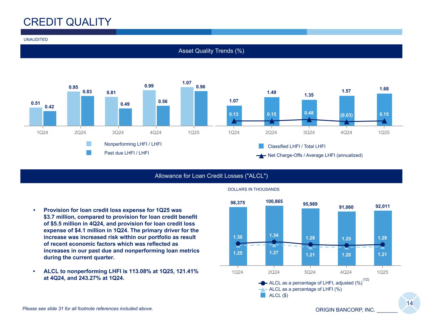 ORIGIN BANCORP, INC. _______ Commercial & Industrial ("C&I") 27% Owner Occupied Commercial Real Estate ("CRE") Non-Owner Occupied CRE 19% C&D: 11% Multi- Family Real Estate Residential Real Estate - Single Family & Consumer 13 WELL DIVERSIFIED LOAN PORTFOLIO (Dollars in thousands) 1Q25 4Q24 3Q24 2Q24 1Q24 C&I 2,022,085 2,002,634 2,074,037 2,070,947 2,154,151 Owner Occupied CRE 937,985 975,947 991,671 959,850 948,624 MW LOC 404,131 349,081 495,188 506,505 400,995 Total Commercial 3,364,201 3,327,662 3,560,896 3,537,302 3,503,770 Non-Owner Occupied CRE 1,445,864 1,501,484 1,533,093 1,563,152 1,472,164 C&D 798,609 864,011 991,545 1,017,389 1,168,597 Multi-Family Real Estate 489,765 425,460 434,317 398,202 359,765 Residential Real Estate- Single Family 1,465,192 1,432,129 1,414,013 1,421,027 1,373,532 Consumer Loans 21,895 22,967 22,926 22,099 22,199 Total LHFI 7,585,526 7,573,713 7,956,790 7,959,171 7,900,027 Loan Portfolio Details ($) Non-Owner Occupied CRE, C&D and Multi-Family: $2,734 million C&I, Owner Occupied CRE and MW LOC: $3,364 million C&I, Owner Occupied CRE, MW LOC: 44% Non-Owner Occupied CRE, C&D, Multi-Family: 36% Loan Composition at March 31, 2025: $7,586 million Please see slide 31 for all footnote references included above. UNAUDITED (11) MW LOC 6% 20% 12% 5% Real Estate & Construction: 8% Multi-Family Real Estate: 6% Retail Shopping: 6% Office Building: 5% Multi-Family under Construction: 3% Healthcare: 2% Hotels: 1% Auto-Related: 1% Restaurants: 1% Consumer: 1% Finance & Insurance: 1% Professional Services: 1% Finance & Insurance: 7% Real Estate & Construction: 7% Mortgage Warehouse Lending: 5% Energy: 3% Transportation Services: 3% Healthcare: 2% Retail Shopping: 2% Retail Dealers: 1% Professional Services: 1% Entertainment & Recreation: 1% Restaurants: 1% Consumer Services: 1% Banks : 1% Utilities: 1% Commercial Services: 1%Misc. : 7%