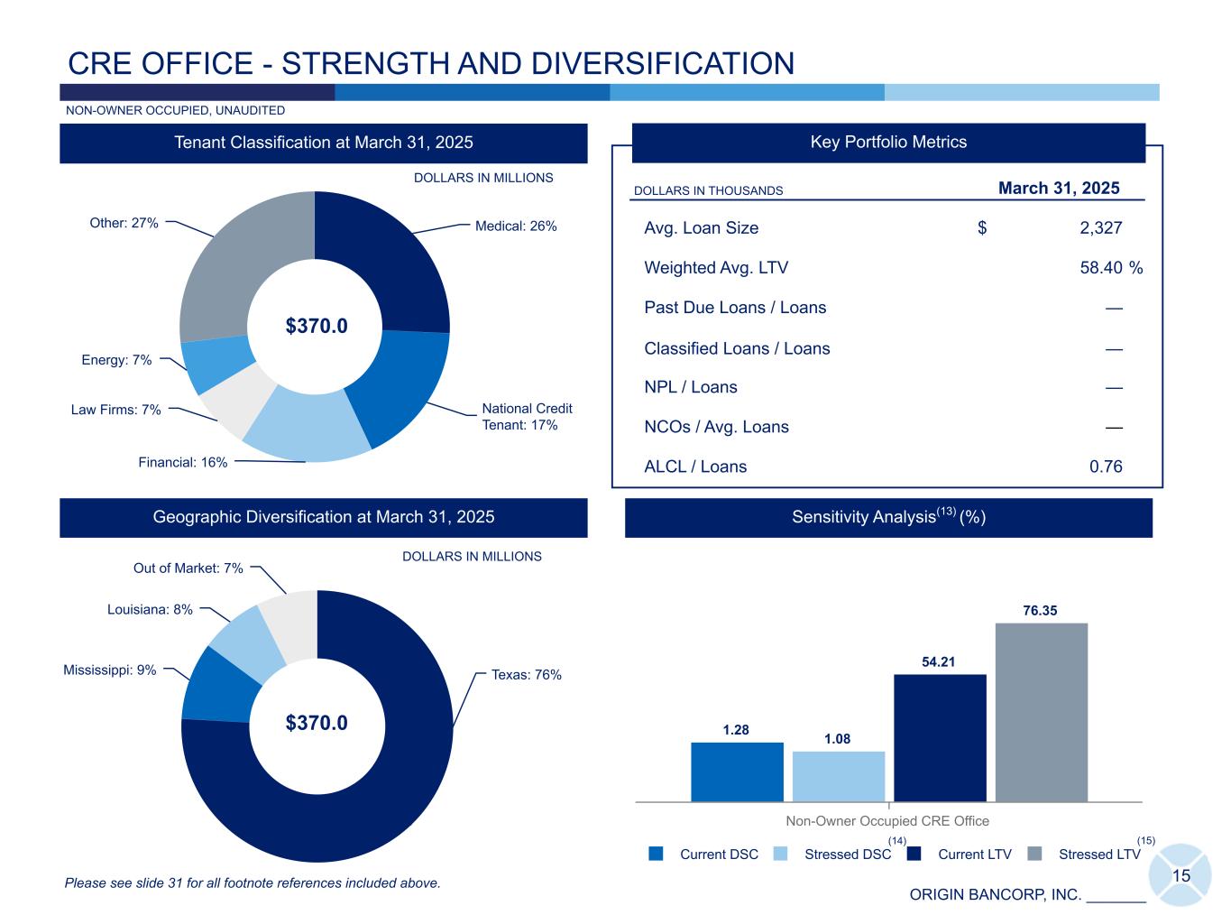 ORIGIN BANCORP, INC. _______ 1.07 1.49 1.35 1.57 1.68 0.13 0.15 0.48 (0.03) 0.15 Classified LHFI / Total LHFI Net Charge-Offs / Average LHFI (annualized) 1Q24 2Q24 3Q24 4Q24 1Q25 0.51 0.95 0.81 0.99 1.07 0.42 0.83 0.49 0.56 0.96 Nonperforming LHFI / LHFI Past due LHFI / LHFI 1Q24 2Q24 3Q24 4Q24 1Q25 14 CREDIT QUALITY Asset Quality Trends (%) Allowance for Loan Credit Losses ("ALCL") 98,375 100,865 95,989 91,060 92,011 1.25 1.27 1.21 1.20 1.21 1.30 1.34 1.28 1.25 1.28 ALCL as a percentage of LHFI, adjusted (%) ALCL as a percentage of LHFI (%) ALCL ($) 1Q24 2Q24 3Q24 4Q24 1Q25 • Provision for loan credit loss expense for 1Q25 was $3.7 million, compared to provision for loan credit benefit of $5.5 million in 4Q24, and provision for loan credit loss expense of $4.1 million in 1Q24. The primary driver for the increase was increased risk within our portfolio as result of recent economic factors which was reflected as increases in our past due and nonperforming loan metrics during the current quarter. • ALCL to nonperforming LHFI is 113.08% at 1Q25, 121.41% at 4Q24, and 243.27% at 1Q24. DOLLARS IN THOUSANDS (12) Please see slide 31 for all footnote references included above. UNAUDITED