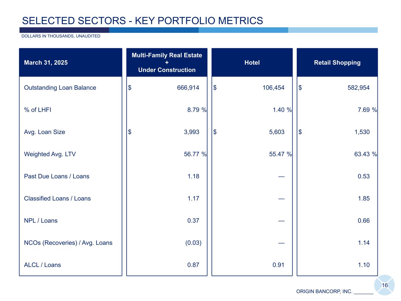 ORIGIN BANCORP, INC. _______ Texas: 76%Mississippi: 9% Louisiana: 8% Out of Market: 7% 15 Medical: 26% National Credit Tenant: 17% Financial: 16% Law Firms: 7% Energy: 7% Other: 27% CRE OFFICE - STRENGTH AND DIVERSIFICATION Tenant Classification at March 31, 2025 $370.0 $370.0 Geographic Diversification at March 31, 2025 DOLLARS IN THOUSANDS March 31, 2025 Avg. Loan Size $ 2,327 Weighted Avg. LTV 58.40 % Past Due Loans / Loans — Classified Loans / Loans — NPL / Loans — NCOs / Avg. Loans — ALCL / Loans 0.76 Key Portfolio Metrics DOLLARS IN MILLIONS DOLLARS IN MILLIONS NON-OWNER OCCUPIED, UNAUDITED Sensitivity Analysis(13) (%) 1.28 1.08 54.21 76.35 Current DSC Stressed DSC Current LTV Stressed LTV Non-Owner Occupied CRE Office (14) Please see slide 31 for all footnote references included above. (15)