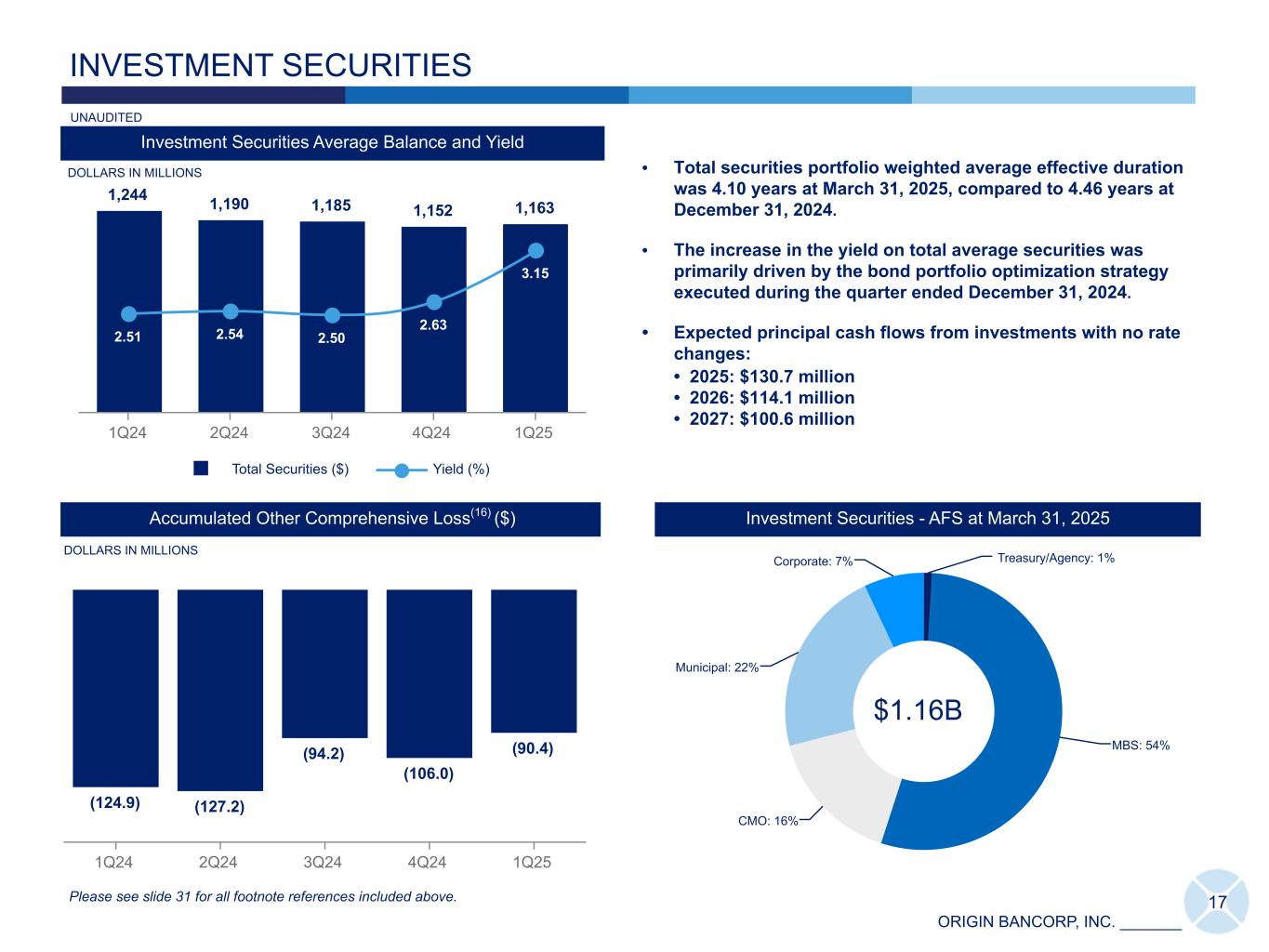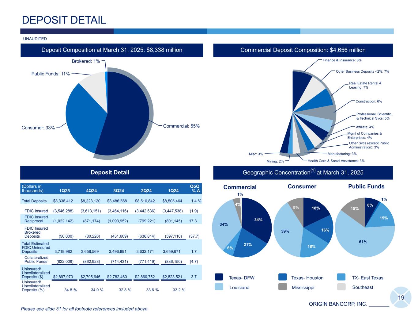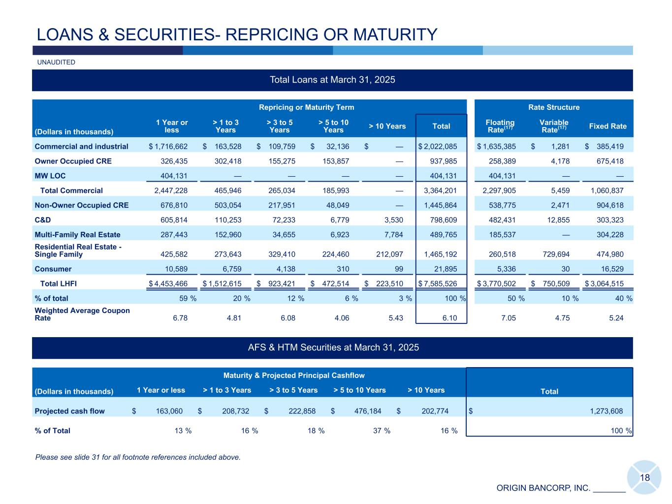 ORIGIN BANCORP, INC. _______ Total Loans at March 31, 2025 (Dollars in thousands) Repricing or Maturity Term Rate Structure 1 Year or less > 1 to 3 Years > 3 to 5 Years > 5 to 10 Years > 10 Years Total Floating Rate(17) Variable Rate(17) Fixed Rate Commercial and industrial $ 1,716,662 $ 163,528 $ 109,759 $ 32,136 $ — $ 2,022,085 $ 1,635,385 $ 1,281 $ 385,419 Owner Occupied CRE 326,435 302,418 155,275 153,857 — 937,985 258,389 4,178 675,418 MW LOC 404,131 — — — — 404,131 404,131 — — Total Commercial 2,447,228 465,946 265,034 185,993 — 3,364,201 2,297,905 5,459 1,060,837 Non-Owner Occupied CRE 676,810 503,054 217,951 48,049 — 1,445,864 538,775 2,471 904,618 C&D 605,814 110,253 72,233 6,779 3,530 798,609 482,431 12,855 303,323 Multi-Family Real Estate 287,443 152,960 34,655 6,923 7,784 489,765 185,537 — 304,228 Residential Real Estate - Single Family 425,582 273,643 329,410 224,460 212,097 1,465,192 260,518 729,694 474,980 Consumer 10,589 6,759 4,138 310 99 21,895 5,336 30 16,529 Total LHFI $ 4,453,466 $ 1,512,615 $ 923,421 $ 472,514 $ 223,510 $ 7,585,526 $ 3,770,502 $ 750,509 $ 3,064,515 % of total 59 % 20 % 12 % 6 % 3 % 100 % 50 % 10 % 40 % Weighted Average Coupon Rate 6.78 4.81 6.08 4.06 5.43 6.10 7.05 4.75 5.24 AFS & HTM Securities at March 31, 2025 (Dollars in thousands) Maturity & Projected Principal Cashflow Total1 Year or less > 1 to 3 Years > 3 to 5 Years > 5 to 10 Years > 10 Years Projected cash flow $ 163,060 $ 208,732 $ 222,858 $ 476,184 $ 202,774 $ 1,273,608 % of Total 13 % 16 % 18 % 37 % 16 % 100 % LOANS & SECURITIES- REPRICING OR MATURITY 18 UNAUDITED Please see slide 31 for all footnote references included above.