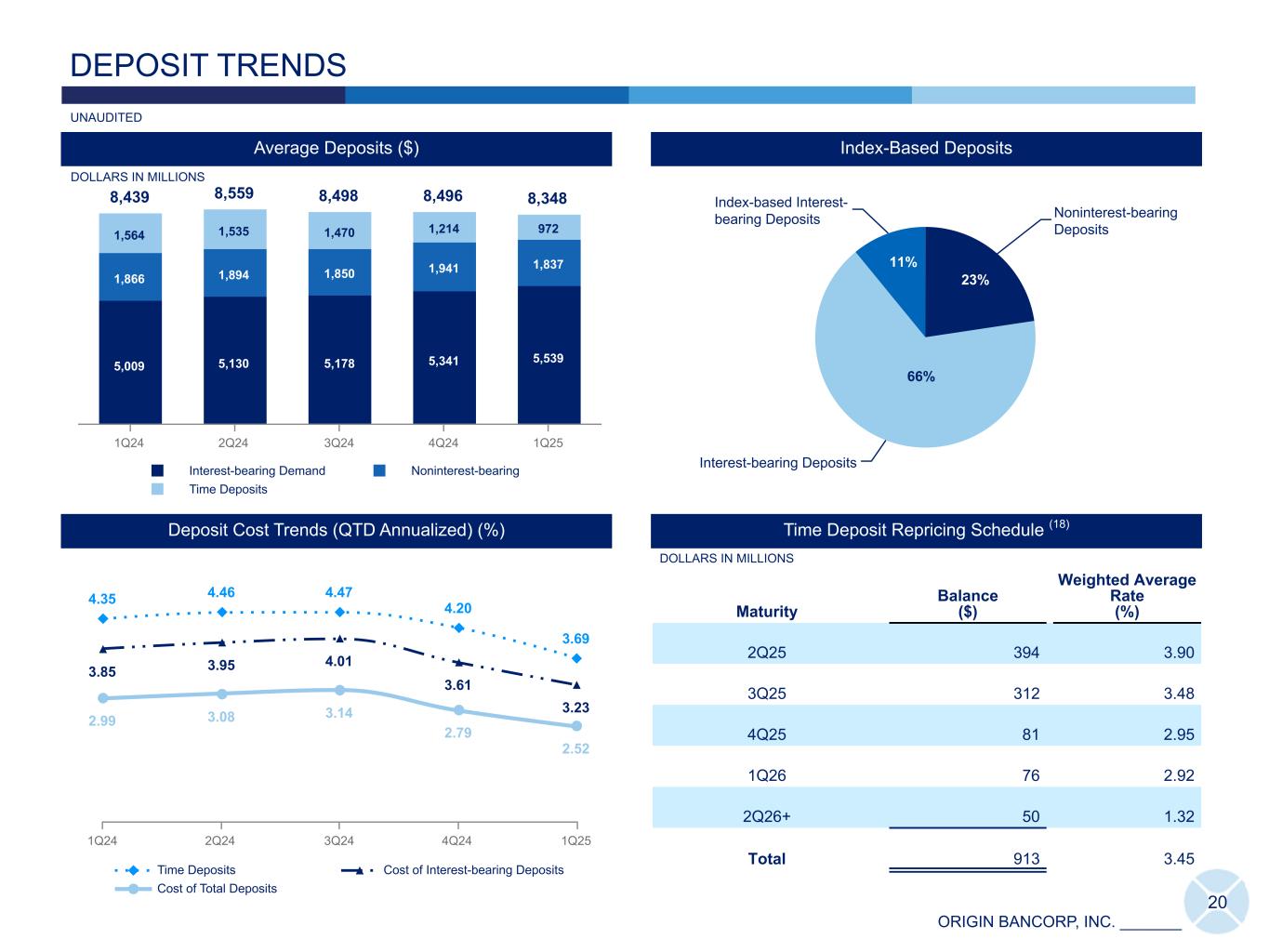 ORIGIN BANCORP, INC. _______ Commercial: 55%Consumer: 33% Public Funds: 11% Brokered: 1% 34% 21% 6% 34% 4% 1% 8% 1% 15% 61% 15% Finance & Insurance: 8% Other Business Deposits <2%: 7% Real Estate Rental & Leasing: 7% Construction: 6% Professional, Scientific, & Technical Svcs: 5% Affiliate: 4% Mgmt of Companies & Enterprises: 4% Other Svcs (except Public Administration): 3% Manufacturing: 3% Health Care & Social Assistance: 3%Mining: 2% Misc: 3% 19 DEPOSIT DETAIL (Dollars in thousands) 1Q25 4Q24 3Q24 2Q24 1Q24 QoQ % Δ Total Deposits $ 8,338,412 $ 8,486,568 $ 8,510,842 $ 8,505,464 $ 8,251,125 (1.7) % FDIC Insured (3,464,116) (3,464,116) (3,442,636) (3,447,538) (3,425,268) — FDIC Insured Reciprocal (1,093,952) (1,093,952) (799,221) (801,145) (801,699) — FDIC Insured Brokered Deposits (431,609) (431,609) (636,814) (597,110) (444,989) — Total Estimated FDIC Uninsured Deposits 3,348,735 3,496,891 3,632,171 3,659,671 3,579,169 (4.2) Collateralized Public Funds (714,431) (714,431) (771,419) (836,150) (849,603) — Uninsured/ Uncollateralized Deposits ($) $ 2,634,304 $ 2,782,460 $ 2,860,752 $ 2,823,521 $ 2,729,566 (5.3) Uninsured/ Uncollateralized Deposits (%) 31.6 % 32.8 % 33.6 % 33.2 % 33.1 % Deposit Detail Geographic Concentration(1) at March 31, 2025 Commercial Deposit Composition: $4,656 million Deposit Composition at March 31, 2025: $8,338 million Commercial Public FundsConsumer MississippiLouisiana Texas- DFW TX- East TexasTexas- Houston Please see slide 31 for all footnote references included above. UNAUDITED Southeast 18% 16% 18% 39% 9% (Dollars in thousands) 1Q25 4Q24 3Q24 2Q24 1Q24 QoQ % Δ Total Deposits $ 8,338,412 $ 8,223,120 $ 8,486,568 $ 8,510,842 $ 8,505,464 1.4 % FDIC Insured (3,546,288) (3,613,151) (3,464,116) (3,442,636) (3,447,538) (1.9) FDIC Insured Reciprocal (1,022,142) (871,174) (1,093,952) (799,221) (801,145) 17.3 FDIC Insured Brokered Deposits (50,000) (80,226) (431,609) (636,814) (597,110) (37.7) Total Estimated FDIC Uninsured Deposits 3,719,982 3,658,569 3,496,891 3,632,171 3,659,671 1.7 Collateralized Public Funds (822,009) (862,923) (714,431) (771,419) (836,150) (4.7) Uninsured/ Uncollateralized Deposits ($) $ 2,897,973 $ 2,795,646 $ 2,782,460 $ 2,860,752 $ 2,823,521 3.7 Uninsured/ Uncollateralized Deposits (%) 34.8 % 34.0 % 32.8 % 33.6 % 33.2 % Deposit Detail