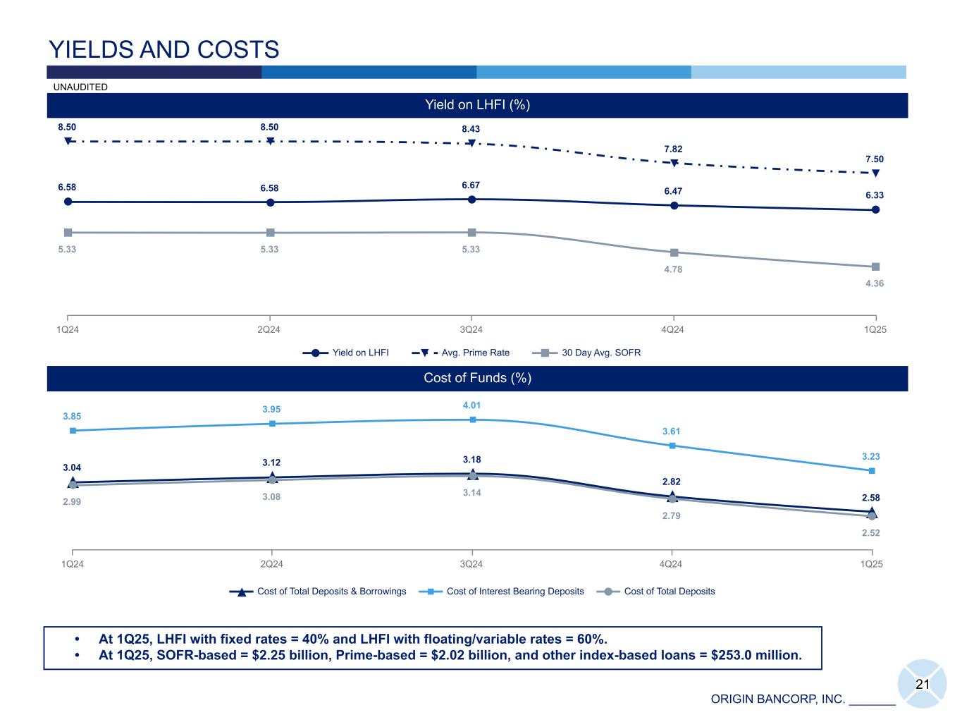 ORIGIN BANCORP, INC. _______ 20 8,439 8,559 8,498 8,496 8,348 5,009 5,130 5,178 5,341 5,539 1,866 1,894 1,850 1,941 1,837 1,564 1,535 1,470 1,214 972 Interest-bearing Demand Noninterest-bearing Time Deposits 1Q24 2Q24 3Q24 4Q24 1Q25 Average Deposits ($) DEPOSIT TRENDS IDT Index-Based Deposits DOLLARS IN MILLIONS UNAUDITED Deposit Cost Trends (QTD Annualized) (%) 4.35 4.46 4.47 4.20 3.69 3.85 3.95 4.01 3.61 3.23 2.99 3.08 3.14 2.79 2.52 Time Deposits Cost of Interest-bearing Deposits Cost of Total Deposits 1Q24 2Q24 3Q24 4Q24 1Q25 Time Deposit Repricing Schedule (18) Maturity Balance ($) Weighted Average Rate (%) 2Q25 394 3.90 3Q25 312 3.48 4Q25 81 2.95 1Q26 76 2.92 2Q26+ 50 1.32 Total 913 3.45 DOLLARS IN MILLIONS Noninterest-bearing Deposits Interest-bearing Deposits Index-based Interest- bearing Deposits 11% 66% 23%