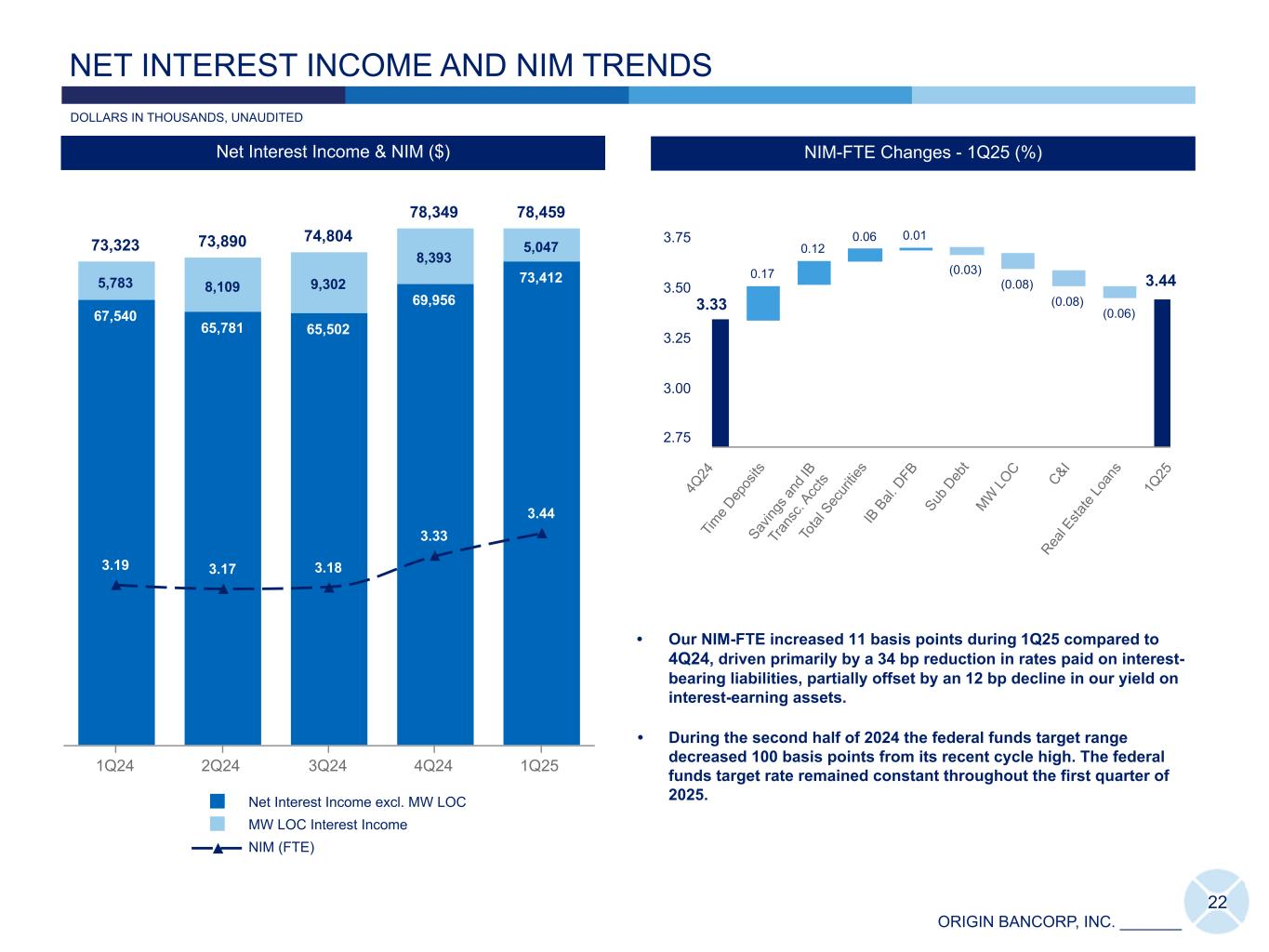 ORIGIN BANCORP, INC. _______ 73,323 73,890 74,804 78,349 78,459 67,540 65,781 65,502 69,956 73,4125,783 8,109 9,302 8,393 5,047 3.19 3.17 3.18 3.33 3.44 Net Interest Income excl. MW LOC MW LOC Interest Income NIM (FTE) 1Q24 2Q24 3Q24 4Q24 1Q25 22 DOLLARS IN THOUSANDS, UNAUDITED NET INTEREST INCOME AND NIM TRENDS 3.33 0.17 0.12 0.06 0.01 (0.03) (0.08) (0.08) (0.06) 4Q 24 Tim e D ep os its Sav ing s a nd IB Tr an sc . A cc ts To tal S ec ur itie s IB B al. D FB Sub D eb t MW LO C C&I Rea l E sta te Lo an s 1Q 25 2.75 3.00 3.25 3.50 3.75 24.64 29.52 21.01 8.58 2.04 2.480.12 0.77 2.18 3.65 4.99 5.26 5.33 4.65 Cumulative NIM-FTE Beta Average Quarterly Fed Funds Rate 2Q22 3Q22 4Q22 1Q23 3Q23 4Q23 1Q24 2Q24 1Q25 NIM Beta - 1Q25 (%) 1.54 2.48 4.51 NIM-FTE Changes - 1Q25 (%) NIM-FTE Changes - 1Q25 (%) 73,32372,989 1,362 1,537 568 432 (298) (3,267) 4Q 23 RE Lo an s C&I MW LO C Othe r FH LB & O the r Bor ro wing s Sav ing s & IB Tr an sa c. Acc ts. 1Q 24 40,000 60,000 80,000 • Our NIM-FTE increased 11 basis points during 1Q25 compared to 4Q24, driven primarily by a 34 bp reduction in rates paid on interest- bearing liabilities, partially offset by an 12 bp decline in our yield on interest-earning assets. • During the second half of 2024 the federal funds target range decreased 100 basis points from its recent cycle high. The federal funds target rate remained constant throughout the first quarter of 2025. Net Interest Income & NIM ($) 3.44