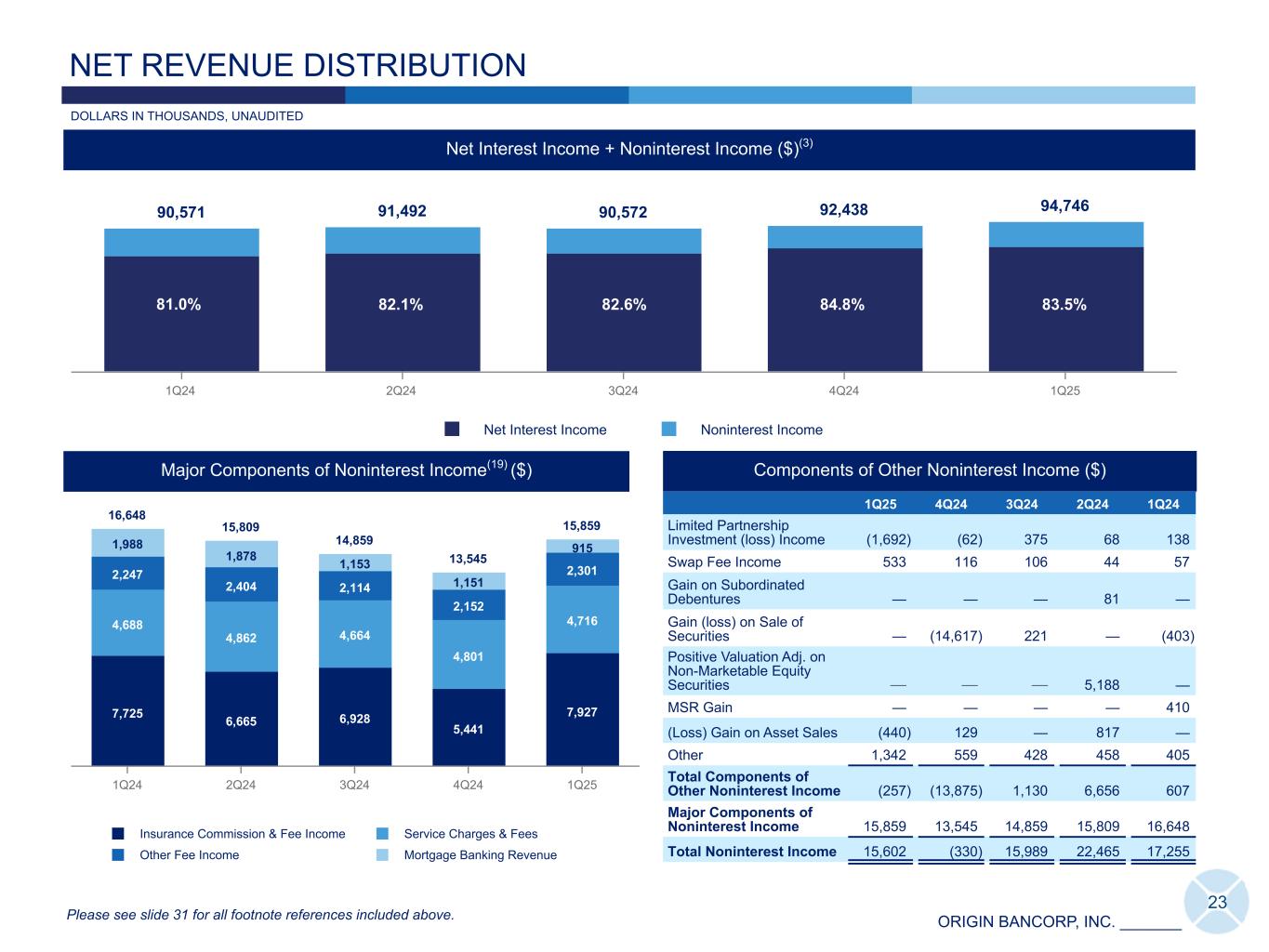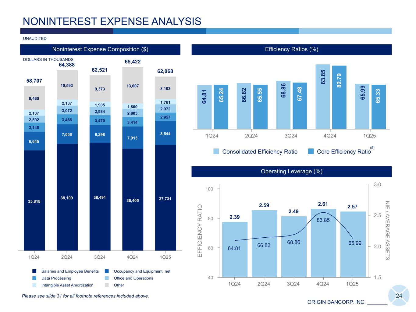 ORIGIN BANCORP, INC. _______ 90,571 91,492 90,572 92,438 94,746 Net Interest Income Noninterest Income 1Q24 2Q24 3Q24 4Q24 1Q25 16,648 15,809 14,859 13,545 15,859 7,725 6,665 6,928 5,441 7,927 4,688 4,862 4,664 4,801 4,716 2,247 2,404 2,114 2,152 2,301 1,988 1,878 1,153 1,151 915 Insurance Commission & Fee Income Service Charges & Fees Other Fee Income Mortgage Banking Revenue 1Q24 2Q24 3Q24 4Q24 1Q25 23 Major Components of Noninterest Income(19) ($) Net Interest Income + Noninterest Income ($)(3) NET REVENUE DISTRIBUTION Components of Other Noninterest Income ($) 1Q25 4Q24 3Q24 2Q24 1Q24 Limited Partnership Investment (loss) Income (1,692) (62) 375 68 138 Swap Fee Income 533 116 106 44 57 Gain on Subordinated Debentures — — — 81 — Gain (loss) on Sale of Securities — (14,617) 221 — (403) Positive Valuation Adj. on Non-Marketable Equity Securities — — — 5,188 — MSR Gain — — — — 410 (Loss) Gain on Asset Sales (440) 129 — 817 — Other 1,342 559 428 458 405 Total Components of Other Noninterest Income (257) (13,875) 1,130 6,656 607 Major Components of Noninterest Income 15,859 13,545 14,859 15,809 16,648 Total Noninterest Income 15,602 (330) 15,989 22,465 17,255 81.0% 83.5% Please see slide 31 for all footnote references included above. DOLLARS IN THOUSANDS, UNAUDITED 84.8%82.6%82.1%