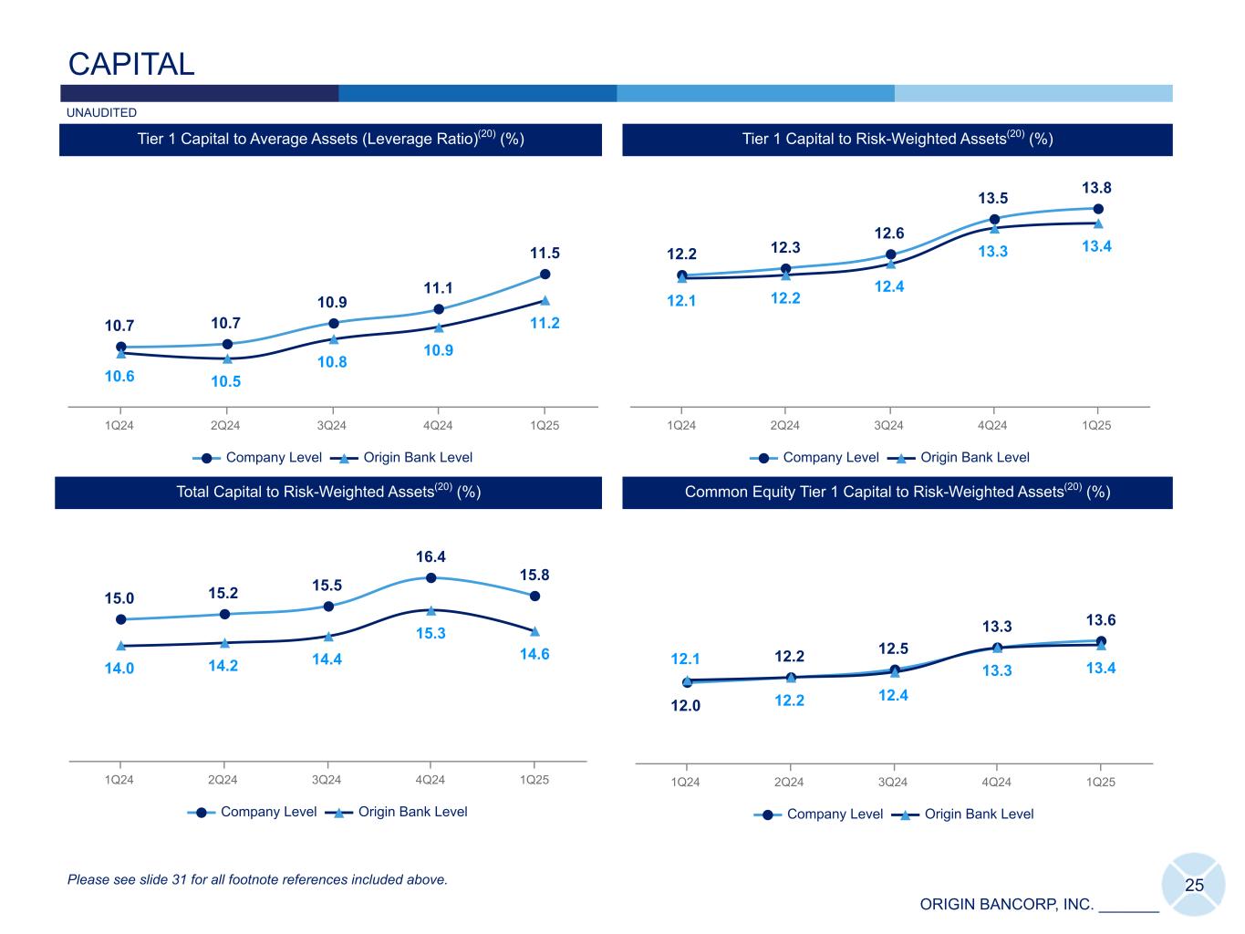 ORIGIN BANCORP, INC. _______ 10.7 10.7 10.9 11.1 11.5 10.6 10.5 10.8 10.9 11.2 Company Level Origin Bank Level 1Q24 2Q24 3Q24 4Q24 1Q25 12.2 12.3 12.6 13.5 13.8 12.1 12.2 12.4 13.3 13.4 Company Level Origin Bank Level 1Q24 2Q24 3Q24 4Q24 1Q25 25 CAPITAL 15.0 15.2 15.5 16.4 15.8 14.0 14.2 14.4 15.3 14.6 Company Level Origin Bank Level 1Q24 2Q24 3Q24 4Q24 1Q25 Common Equity Tier 1 Capital to Risk-Weighted Assets(20) (%) ICap ICap Total Capital to Risk-Weighted Assets(20) (%) Tier 1 Capital to Risk-Weighted Assets(20) (%)Tier 1 Capital to Average Assets (Leverage Ratio)(20) (%) Please see slide 31 for all footnote references included above. UNAUDITED 12.0 12.2 12.5 13.3 13.6 12.1 12.2 12.4 13.3 13.4 Company Level Origin Bank Level 1Q24 2Q24 3Q24 4Q24 1Q25