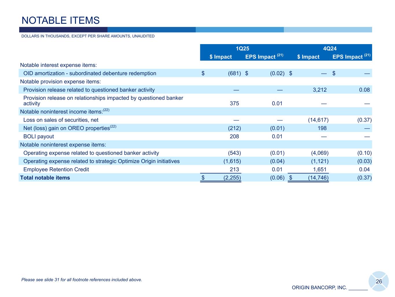ORIGIN BANCORP, INC. _______ 1Q25 4Q24 $ Impact EPS Impact (21) $ Impact EPS Impact (21) Notable interest expense items: OID amortization - subordinated debenture redemption $ (681) $ (0.02) $ — $ — Notable provision expense items: Provision release related to questioned banker activity — — 3,212 0.08 Provision release on relationships impacted by questioned banker activity 375 0.01 — — Notable noninterest income items:(22) Loss on sales of securities, net — — (14,617) (0.37) Net (loss) gain on OREO properties(22) (212) (0.01) 198 — BOLI payout 208 0.01 — — Notable noninterest expense items: Operating expense related to questioned banker activity (543) (0.01) (4,069) (0.10) Operating expense related to strategic Optimize Origin initiatives (1,615) (0.04) (1,121) (0.03) Employee Retention Credit 213 0.01 1,651 0.04 Total notable items $ (2,255) (0.06) $ (14,746) (0.37) 26 DOLLARS IN THOUSANDS, EXCEPT PER SHARE AMOUNTS, UNAUDITED NOTABLE ITEMS Please see slide 31 for all footnote references included above.