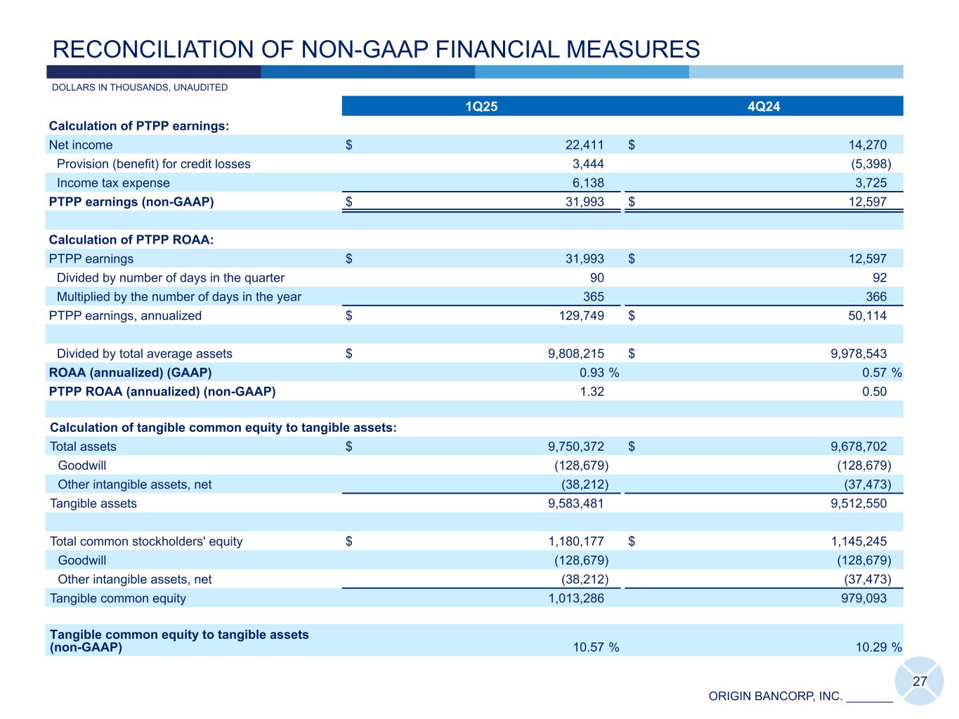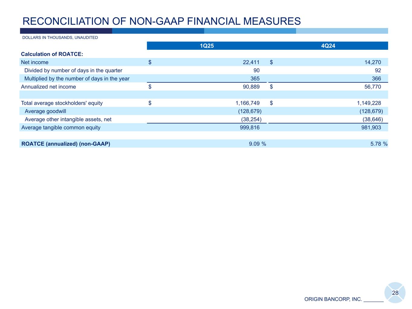 ORIGIN BANCORP, INC. _______ 1Q25 4Q24 Calculation of PTPP earnings: Net income $ 22,411 $ 14,270 Provision (benefit) for credit losses 3,444 (5,398) Income tax expense 6,138 3,725 PTPP earnings (non-GAAP) $ 31,993 $ 12,597 Calculation of PTPP ROAA: PTPP earnings $ 31,993 $ 12,597 Divided by number of days in the quarter 90 92 Multiplied by the number of days in the year 365 366 PTPP earnings, annualized $ 129,749 $ 50,114 Divided by total average assets $ 9,808,215 $ 9,978,543 ROAA (annualized) (GAAP) 0.93 % 0.57 % PTPP ROAA (annualized) (non-GAAP) 1.32 0.50 Calculation of tangible common equity to tangible assets: Total assets $ 9,750,372 $ 9,678,702 Goodwill (128,679) (128,679) Other intangible assets, net (38,212) (37,473) Tangible assets 9,583,481 9,512,550 Total common stockholders' equity $ 1,180,177 $ 1,145,245 Goodwill (128,679) (128,679) Other intangible assets, net (38,212) (37,473) Tangible common equity 1,013,286 979,093 Tangible common equity to tangible assets (non-GAAP) 10.57 % 10.29 % 27 DOLLARS IN THOUSANDS, UNAUDITED RECONCILIATION OF NON-GAAP FINANCIAL MEASURES