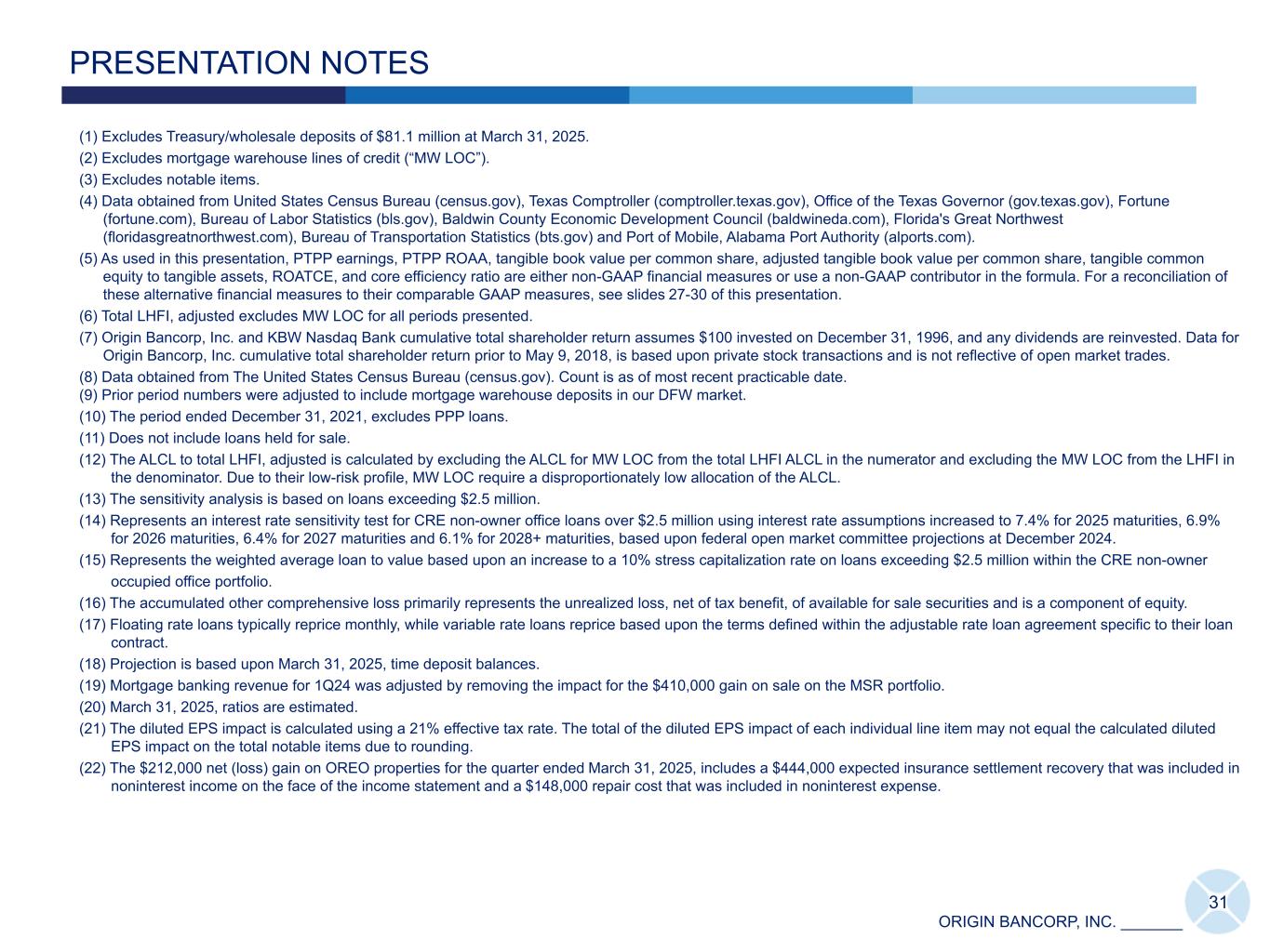 ORIGIN BANCORP, INC. _______ 31 PRESENTATION NOTES (1) Excludes Treasury/wholesale deposits of $81.1 million at March 31, 2025. (2) Excludes mortgage warehouse lines of credit (“MW LOC”). (3) Excludes notable items. (4) Data obtained from United States Census Bureau (census.gov), Texas Comptroller (comptroller.texas.gov), Office of the Texas Governor (gov.texas.gov), Fortune (fortune.com), Bureau of Labor Statistics (bls.gov), Baldwin County Economic Development Council (baldwineda.com), Florida's Great Northwest (floridasgreatnorthwest.com), Bureau of Transportation Statistics (bts.gov) and Port of Mobile, Alabama Port Authority (alports.com). (5) As used in this presentation, PTPP earnings, PTPP ROAA, tangible book value per common share, adjusted tangible book value per common share, tangible common equity to tangible assets, ROATCE, and core efficiency ratio are either non-GAAP financial measures or use a non-GAAP contributor in the formula. For a reconciliation of these alternative financial measures to their comparable GAAP measures, see slides 27-30 of this presentation. (6) Total LHFI, adjusted excludes MW LOC for all periods presented. (7) Origin Bancorp, Inc. and KBW Nasdaq Bank cumulative total shareholder return assumes $100 invested on December 31, 1996, and any dividends are reinvested. Data for Origin Bancorp, Inc. cumulative total shareholder return prior to May 9, 2018, is based upon private stock transactions and is not reflective of open market trades. (8) Data obtained from The United States Census Bureau (census.gov). Count is as of most recent practicable date. (9) Prior period numbers were adjusted to include mortgage warehouse deposits in our DFW market. (10) The period ended December 31, 2021, excludes PPP loans. (11) Does not include loans held for sale. (12) The ALCL to total LHFI, adjusted is calculated by excluding the ALCL for MW LOC from the total LHFI ALCL in the numerator and excluding the MW LOC from the LHFI in the denominator. Due to their low-risk profile, MW LOC require a disproportionately low allocation of the ALCL. (13) The sensitivity analysis is based on loans exceeding $2.5 million. (14) Represents an interest rate sensitivity test for CRE non-owner office loans over $2.5 million using interest rate assumptions increased to 7.4% for 2025 maturities, 6.9% for 2026 maturities, 6.4% for 2027 maturities and 6.1% for 2028+ maturities, based upon federal open market committee projections at December 2024. (15) Represents the weighted average loan to value based upon an increase to a 10% stress capitalization rate on loans exceeding $2.5 million within the CRE non-owner occupied office portfolio. (16) The accumulated other comprehensive loss primarily represents the unrealized loss, net of tax benefit, of available for sale securities and is a component of equity. (17) Floating rate loans typically reprice monthly, while variable rate loans reprice based upon the terms defined within the adjustable rate loan agreement specific to their loan contract. (18) Projection is based upon March 31, 2025, time deposit balances. (19) Mortgage banking revenue for 1Q24 was adjusted by removing the impact for the $410,000 gain on sale on the MSR portfolio. (20) March 31, 2025, ratios are estimated. (21) The diluted EPS impact is calculated using a 21% effective tax rate. The total of the diluted EPS impact of each individual line item may not equal the calculated diluted EPS impact on the total notable items due to rounding. (22) The $212,000 net (loss) gain on OREO properties for the quarter ended March 31, 2025, includes a $444,000 expected insurance settlement recovery that was included in noninterest income on the face of the income statement and a $148,000 repair cost that was included in noninterest expense.